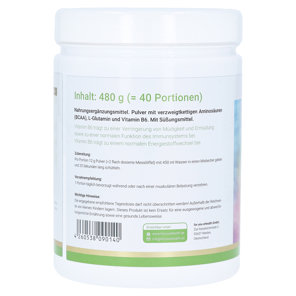 Пищевая добавка содержит разветвленные цепные аминокислоты (BCAA), L-глутамин и витамин B6. Витамин В6 способствует сокращению усталости и усталости, а также нормальной функции иммунной системы и энергетического метаболизма.