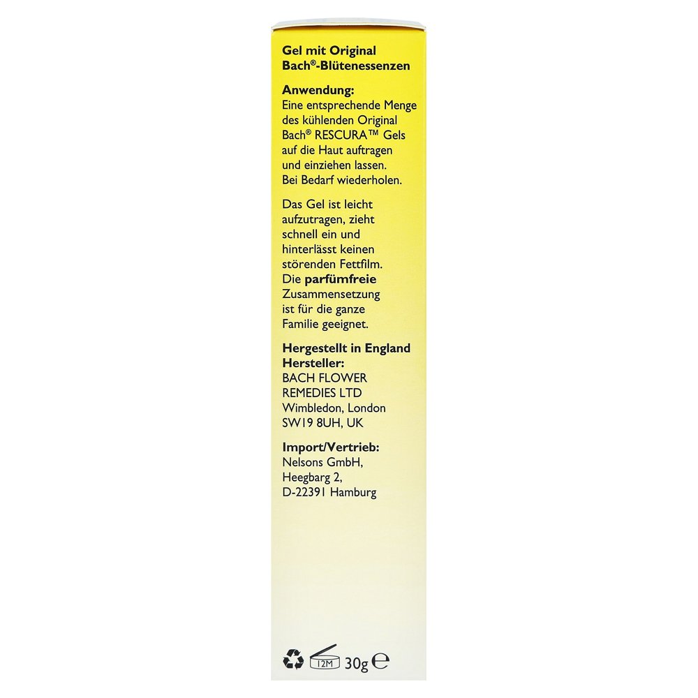 Оригинальный GEL Rescura содержит оригинальную цветочную смесь Bach, в сочетании с оригинальной цветочностью Bach Crab Apple (Wood Apple). Приятная прохладная рессура гель успокаивает чувствительную и напряженную кожу, z. Б. После загорания.