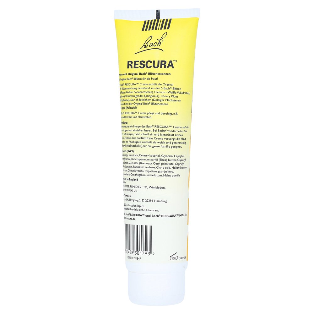 Оригинальный Bach Rescura Cream содержит комбинацию оригинального Bach Blossom Rock Rose (желтые солнечные ожоги), Clematis (белая лесная кишка), недвижимость (гнузелярный прыжок), вишневая слива (вишня) и звезда Вифлеема (Milfstern). Кроме того, она содержит оригинальный Bach Blossom Crab Apple (Wood Apple).