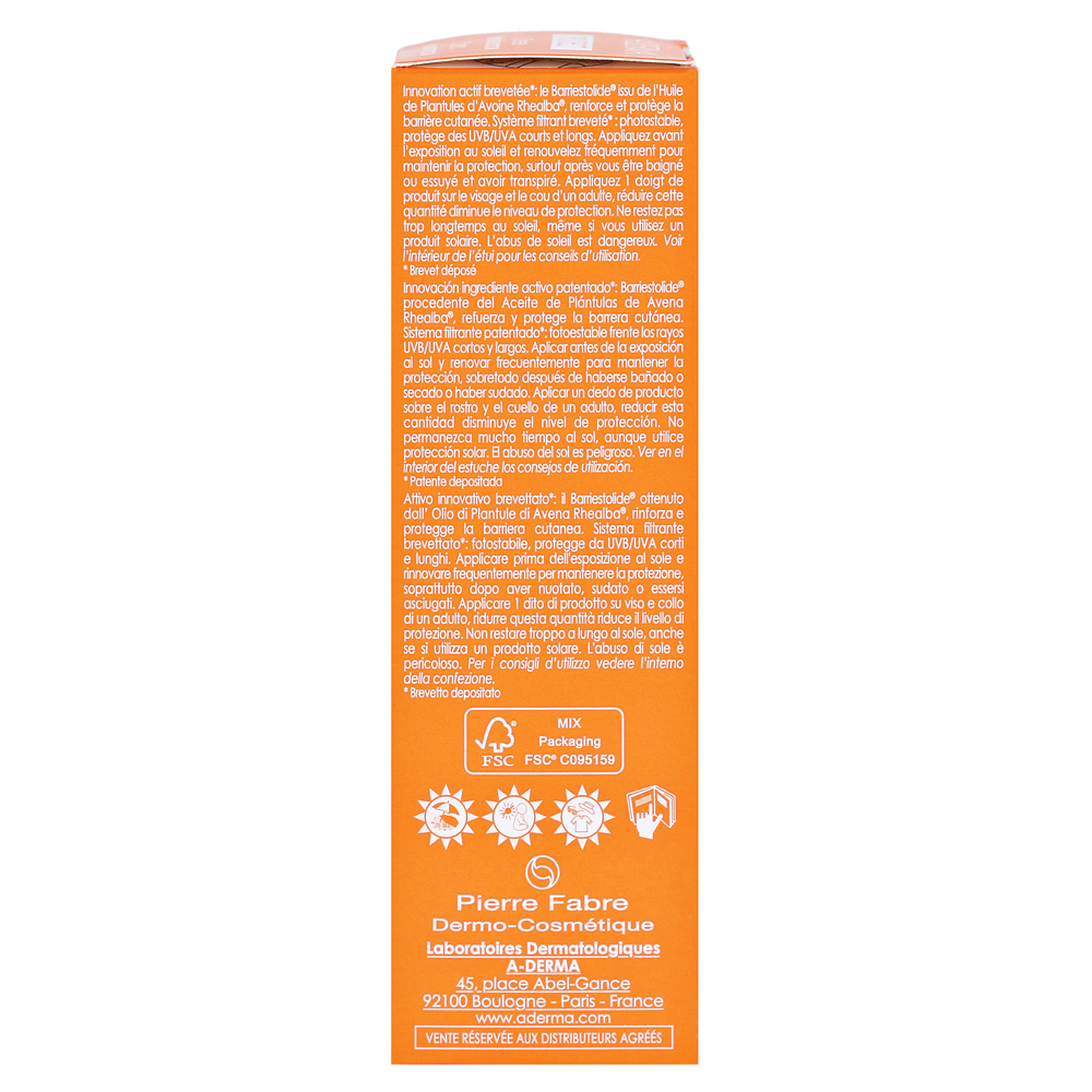 Солнцезащитный крем а-дермы защищает кожу от очень высокого УВА и излучения UVB и укрепляет естественный кожный барьер. Крем идеально подходит для нормальных для сухой кожи лица, а также для солнечной хрупкой кожи.