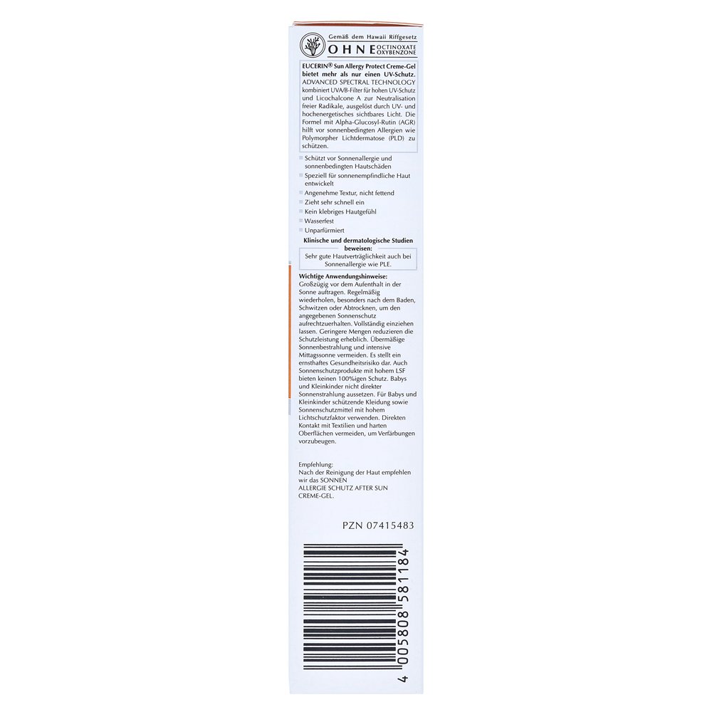 Eucerin Sun Allergy Protect Sun Cream Gel с LSF 50 и расширенной спектральной технологией обеспечивает надежную защиту от ультрафиолетовой ультрафиолетовой защиты для Sun Allergies, таких как PLD (полиморфный легкий дерматоз), наклонная кожа, а также защита от ущерба для солнечных кондиционированных повреждений. Формула солнцезащитного крема с неэрдерфедом снижает риск раздражения кожи.