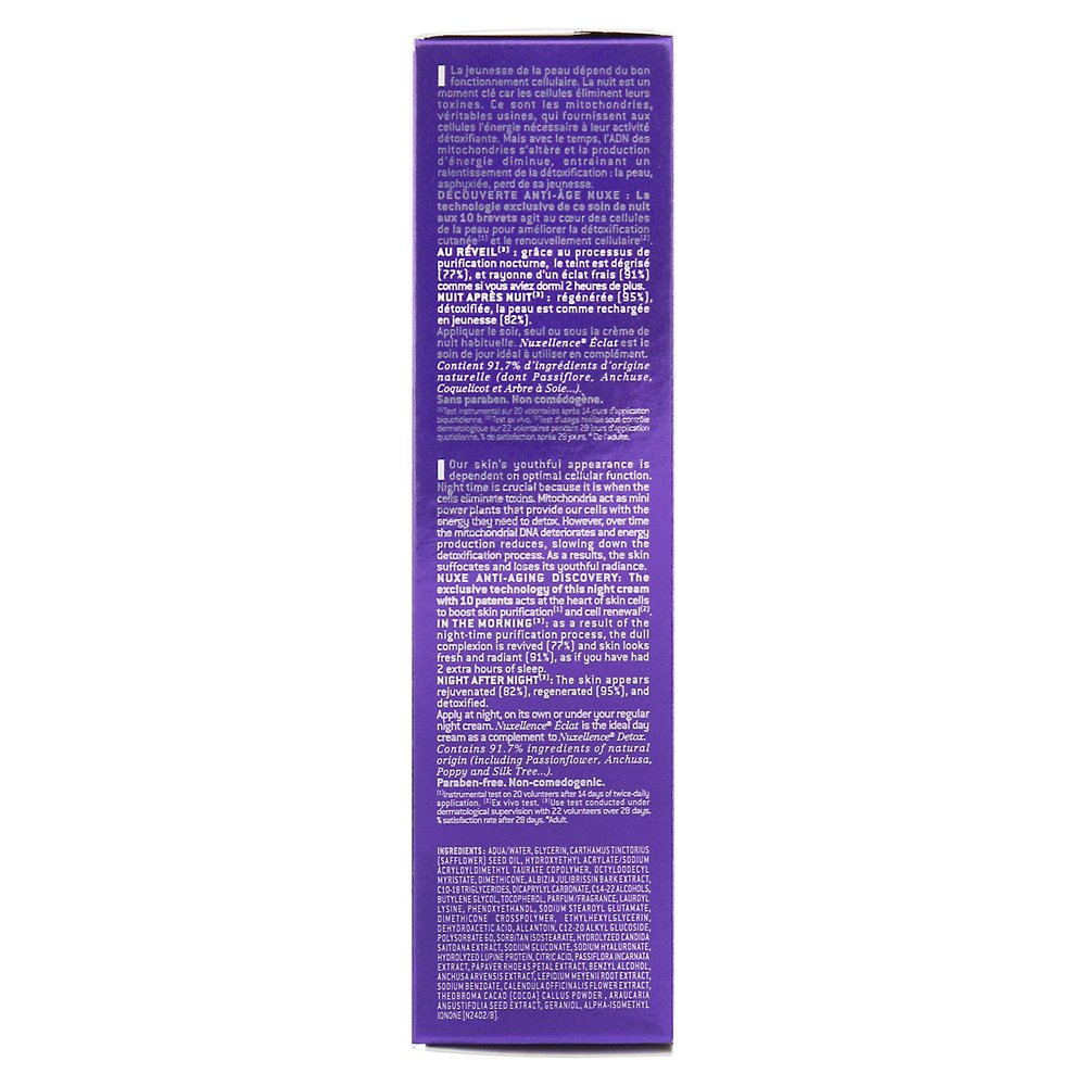 Уход за молодостью и светимостью! Поддерживает регенерацию кожи в течение ночи и дает ей новую яркость. Детокс-ночные моющие средства одновременно с помощью лекарственного комплекса экстракта шелкового дерева и цветка страсти. NUXELLENCE DETOX может применяться как в одиночку, а также при обычной ночной уход.