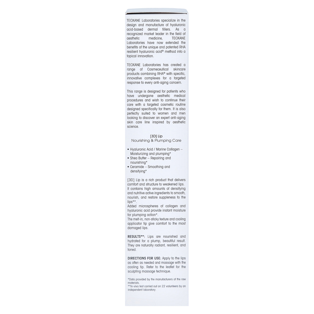 Питательный уход за губами (3D) губы Теоксана заботится о губах нежным и гибким. Гиалуроновая кислота и масло ши, содержащие губы, продолжающиеся с влажностью. Уход за губ является на нефте и может применяться гигиенические благодаря аппликатору.