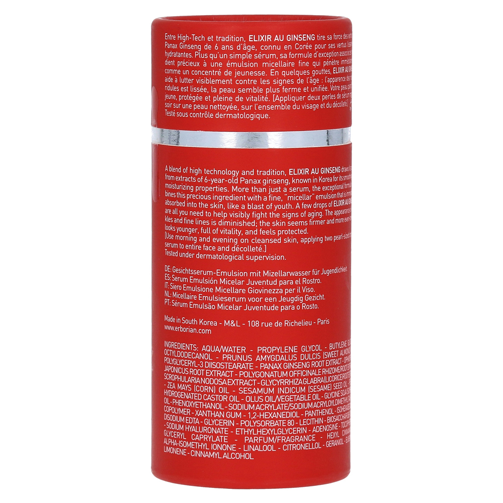 Erborian Elixir Au Ginseng основан на традиционной корейской медицине и современных технологиях. Специальный Panax Ginseng известен в Корее за его укрепляющие и увлажняющие свойства. Сыворотка содержит высококонцентрированные питательные вещества, которые интенсивно восстанавливают кожу. Из-за мицеллярной воды он также проникает специально и быстро.