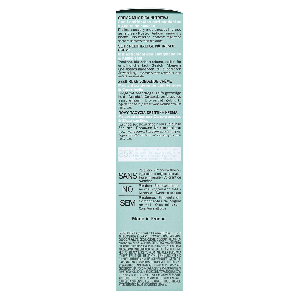 Питательный крем состоит из 85% натуральных ингредиентов и был протестирован под дерматологическим надзором, поэтому он оптимально подходит для чувствительной кожи. Антиоксидативные люмифенолы помогают коже найти свой баланс и построить собственный защитный барьер. Кроме того, нефть Camellia включена, что считается нефтью красоты в Азии и ценится за его исключительно питательные свойства.
