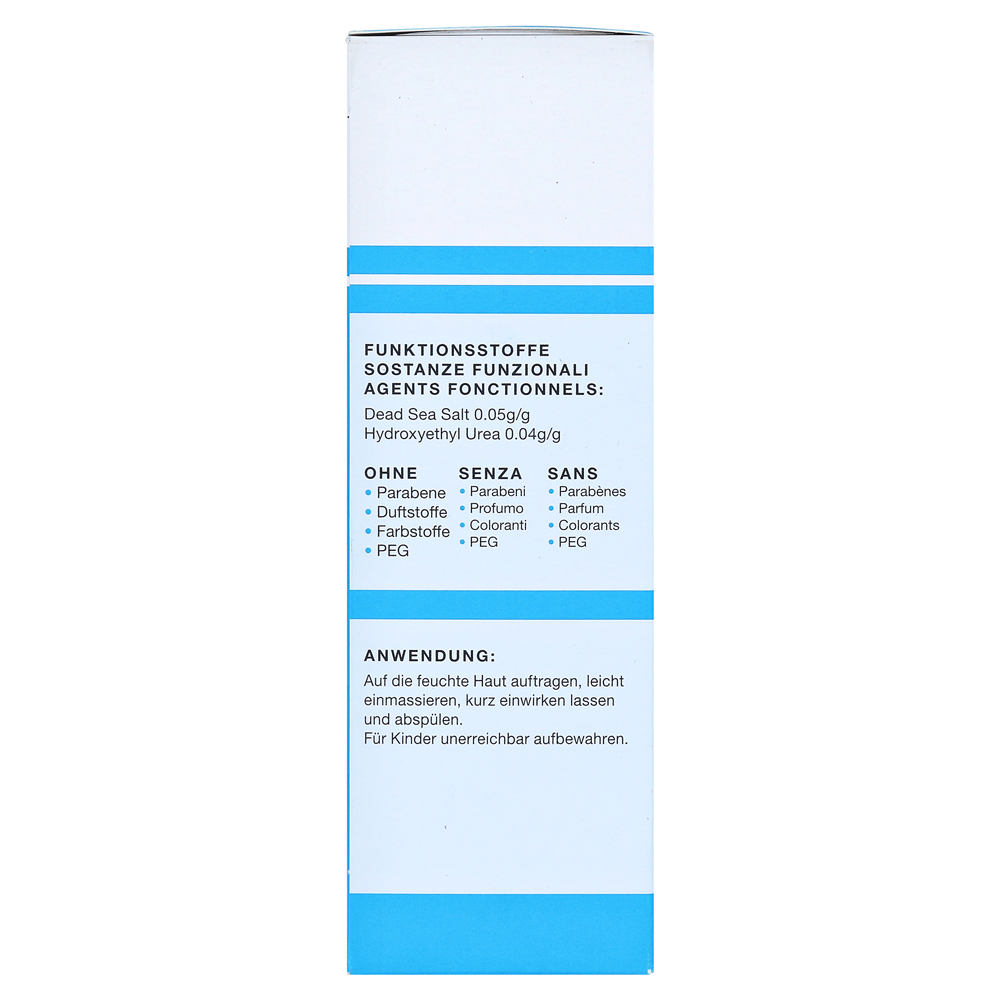Гель для душа осторожно очищает кожу и снабжает их влажностью. Для масштабирования и противовоспалительного имущества соль Мейт-моря обеспечивает не менее 46% хлорида магния. При регулярном использовании повторное образование навеса может быть уменьшено. При обнадеживании ромашки и регенерации — продвижение декспантенола, что способствует нормализации кожи.