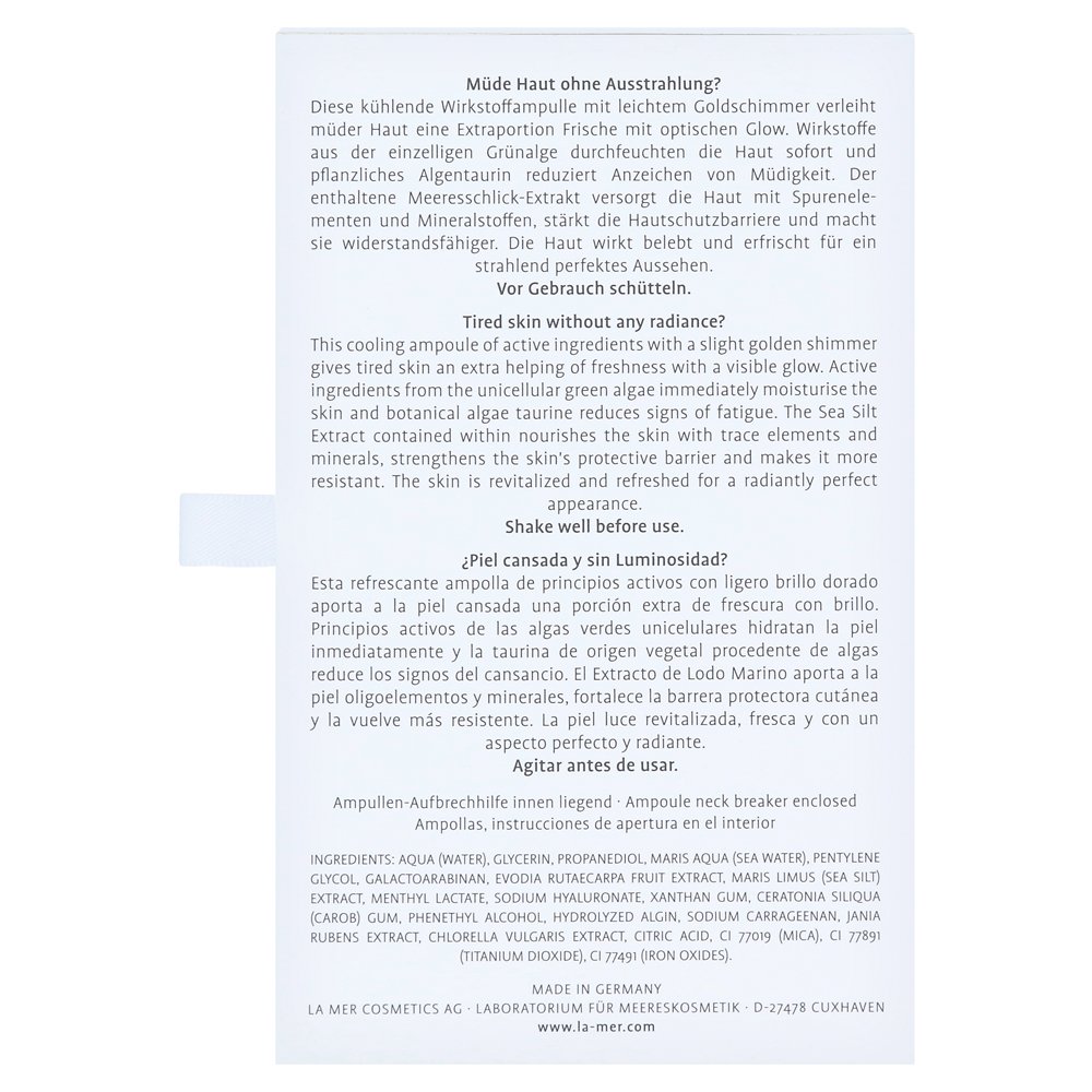 La Mer Ampoule Fresh & Glow обладает охлаждающим эффектом и дает уставшей коже благодаря легким золотым мерцам снова сияющим цветком с оптическим свечением. Зеленый экстракт водорослей питает кожу у влаги. Травяной таурес из Джени Рубенс экстракт снижает признаки усталости и приглашений. Содержанный экстракт морского шика обеспечивает длительную увлажнение кожу и укрепляет защитный барьер кожи. Кожа выглядит освеженной и возрожденной.