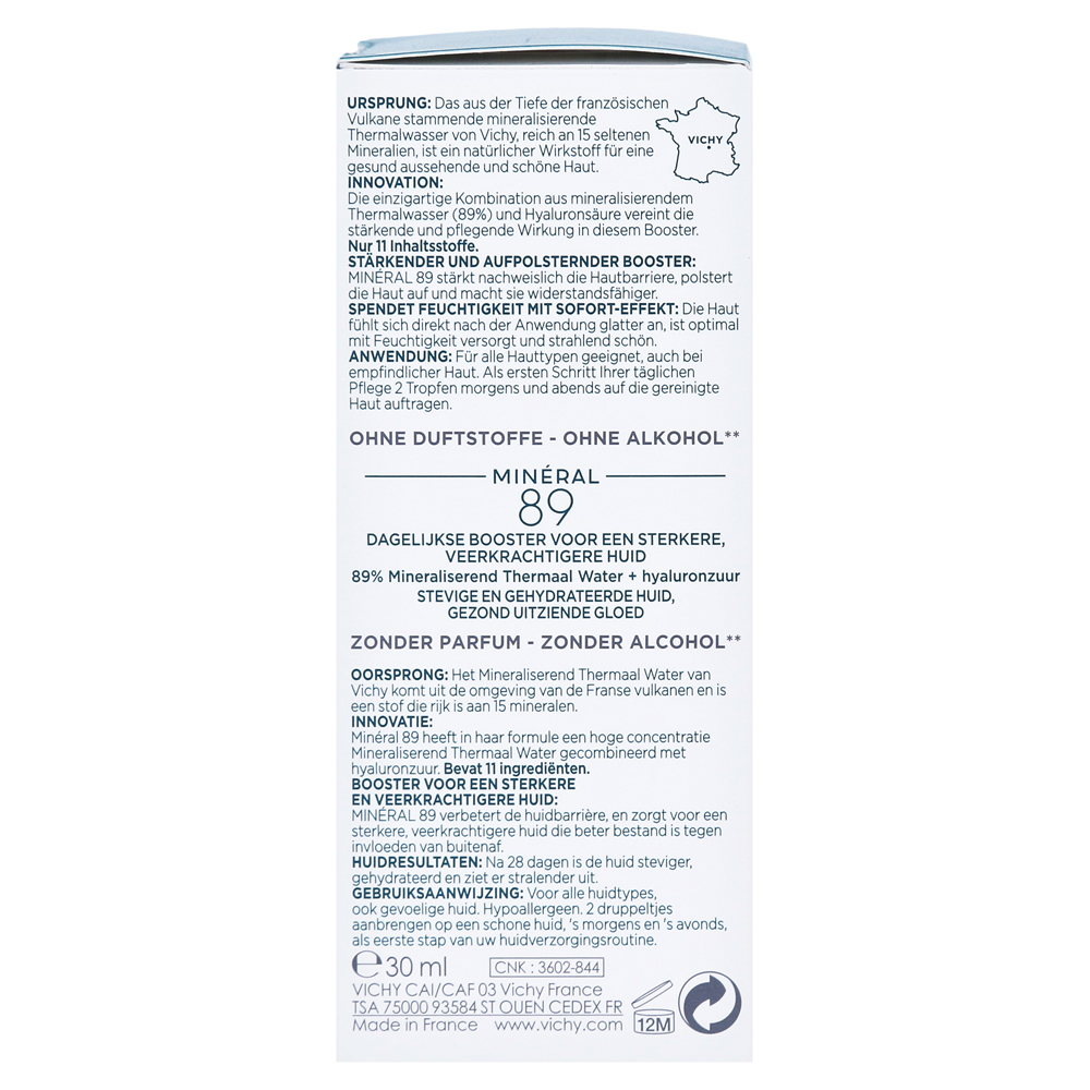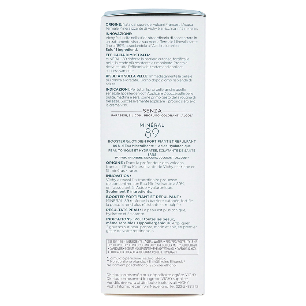 С высококонцентрированной силой 89% тепловой воды: Vichy Minéral 89 принимает свое название тепловой водой, содержащейся в 89%. В сочетании с натуральным гиалуроном эликсир обеспечивает уникальный свежий набор для вашей кожи.