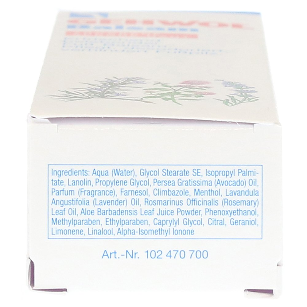 Аллантоин, активное вещество лошадей-каштана; Бисаболол, часть ромашки; Экстракт Hamamelis, ментол и пантенол Акт раздражают, слегка вяжущие и успокаивающиеся в покрасне и пятна.