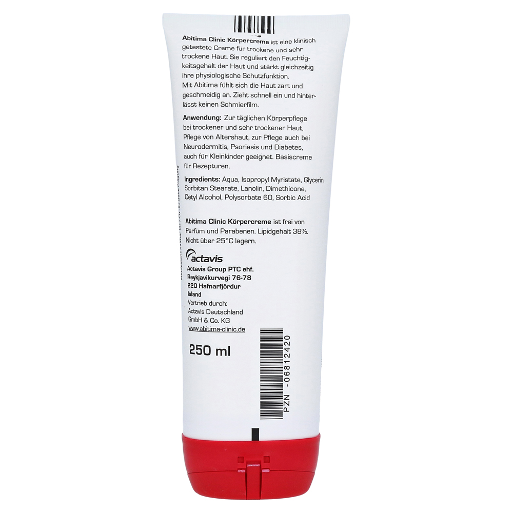 Клиническая клиника Abitima является кремом классического ухода с ланолином и глицерином для сухой кожи. Он обеспечивает немедленную и устойчивую влагу и питательные вещества. Крем может слегка применяться и быстро подниматься.