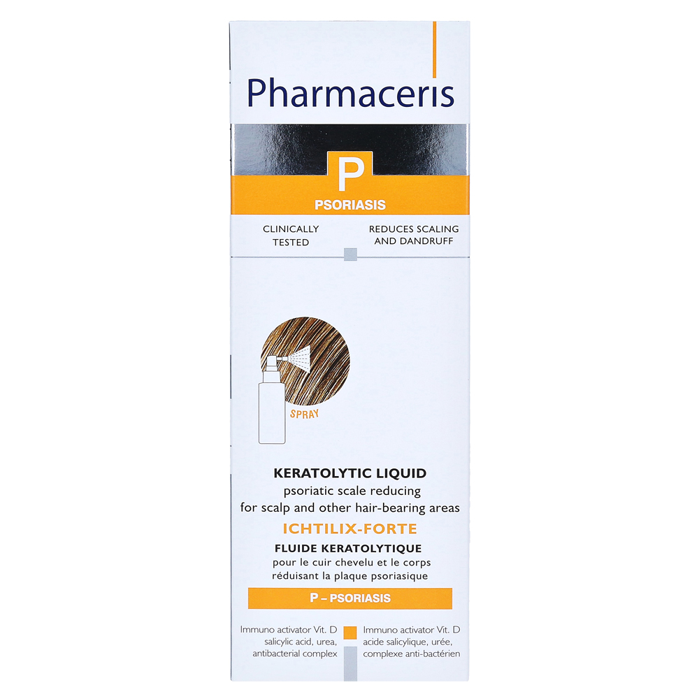 Pharmaceris Ichtilix Forte — кератолитическая жидкость для использования в коже, пораженной псориазом. Спрей может уменьшить псориатический перхоть на кожу головы и другие волосатые области и значительно уменьшают зуд и горения. Раздравленная кожа пожертвована влаги и трудно контролировать, хронические весы могут быть визуально уменьшены. Специализированная терапия с помощью распылителя позволяет расширять время ремиссии и также может использоваться профилактически.