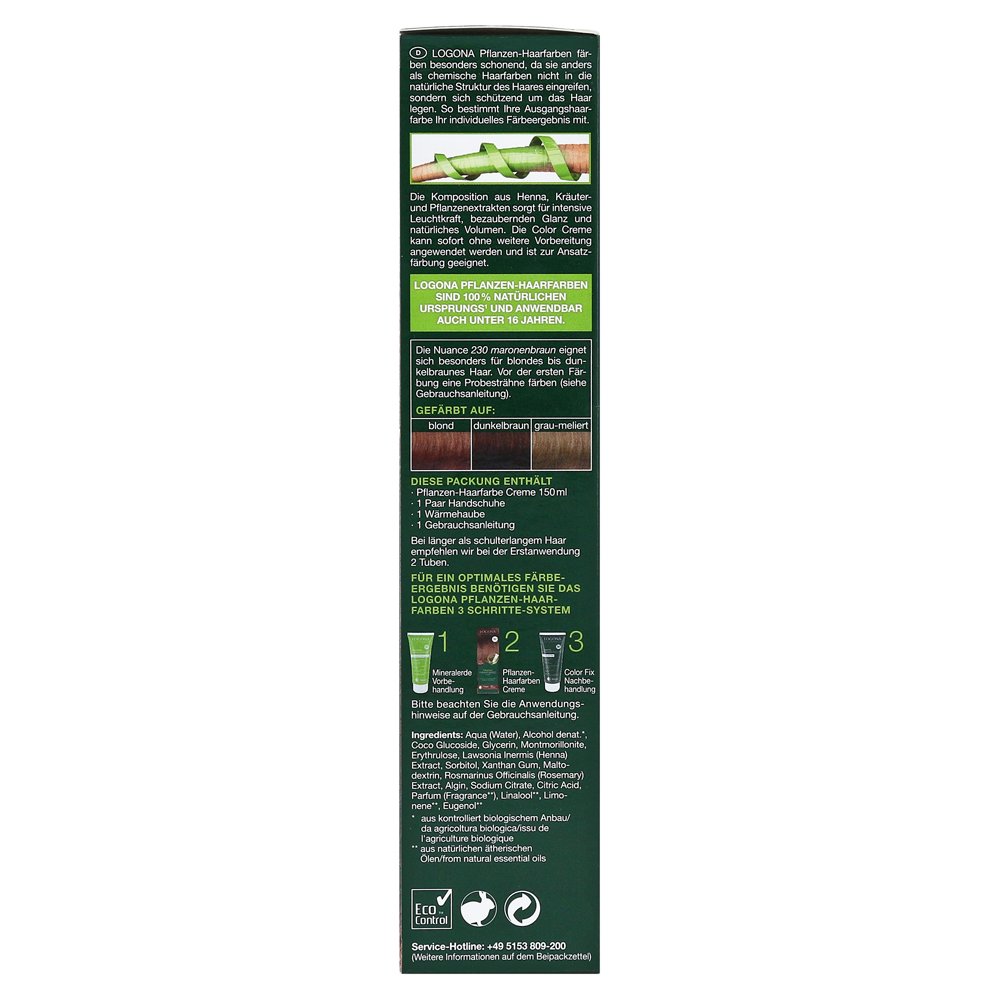 Логона растение волос цвета Марон Браун особенно подходит для блондинки до темно-каштановых волос. Он состоит из 100% ингредиентов естественного происхождения и поэтому может быть использовано в возрасте до 16 лет.