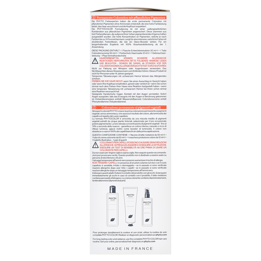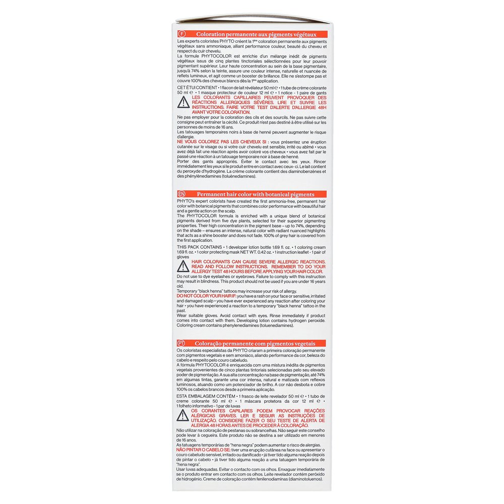 Phytocolor — это постоянная окраска волос, которые идеально сочетают в себе уход за травяными волосами. Он работает без аммиака и содержит до 74% овощных цветовых пигментов. Передовая технология производит блестящий, интенсивный глянцевый цвет и седые волосы длительны. Овощной продукт для ухода за волосами убеждает с максимальной цветовой производительностью из-за растительных пигментов в высокой концентрации. Скальп и волосы пощадили и минимизируют риск аллергии.