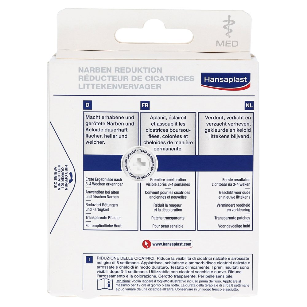 Патч для лечения шрамов Hansaplast подходит для использования с новым и старым, а также возвышенным и уменьшенным шрамам. Видимость рубцов уменьшена примерно через 3-4 недели, а шрамы кажутся постоянно плоскими, яркими и более мягкими.