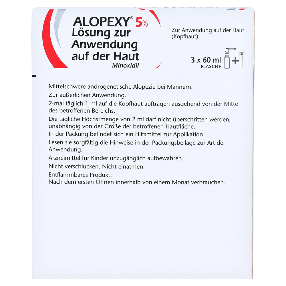 Alopexy 5% применяется утром и вечером непосредственно на сухой кожи головы и, таким образом, действует именно там, где он должен работать — на затронутых диапазонах кожи головы. После сушки раствора волосы могут быть оформлены как обычно. Существует два практических дозирующей помощи — пипетка и дозирующий насос с аппликатором — на выбор, который обеспечивает легкое и несложное приложение.