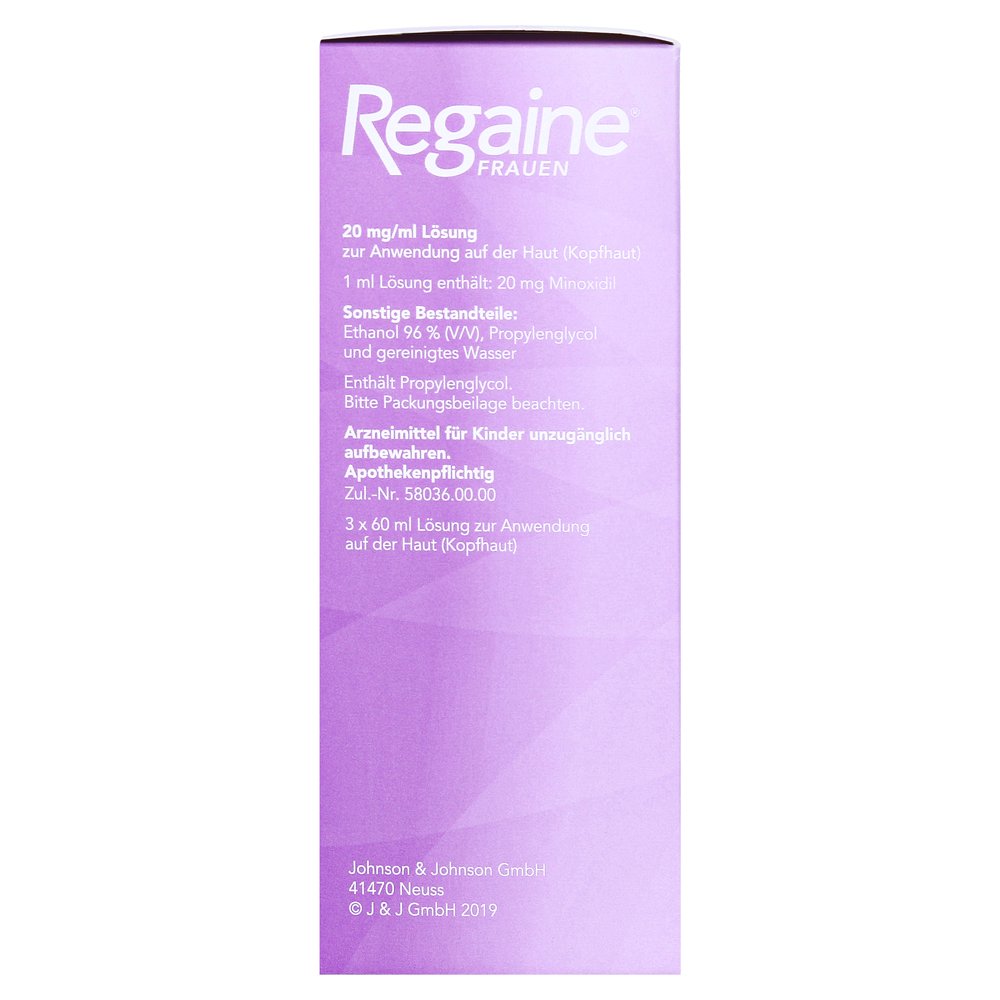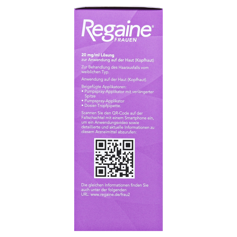 Regaine женщины стабилизируют ход анногенной алопеции у женщин, характерные, связанные с активом диффузной головы истончение волос в теменном секторе и могут противостоять прогрессированию этой алопеции. Лечение Regaine женщин способствует росту волос и противодействует прогрессированию анногенной алопеции.