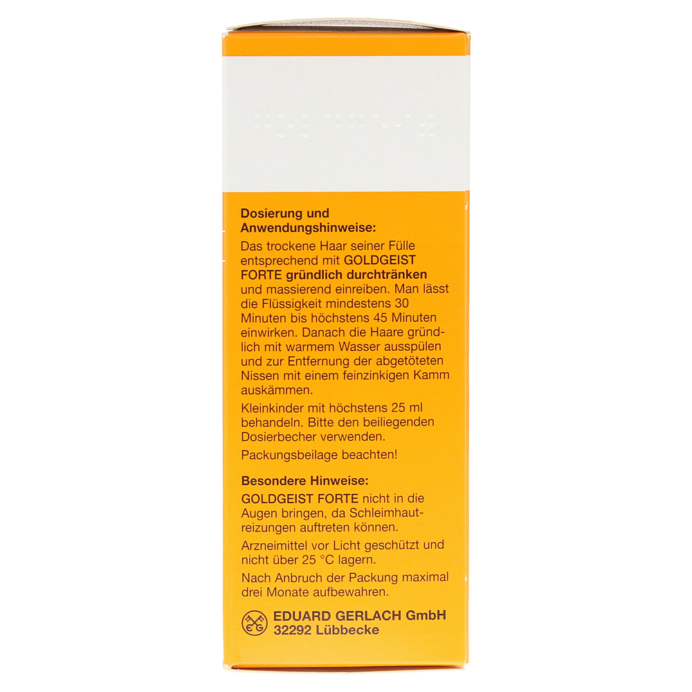 Через 8-12 дней контроль должен быть сделан для хеджирования успеха лечения, я. Чтобы определить, были ли все вши и ниты были записаны при использовании «Goldgeist Forte Liquid». Если вши или живые ниты снова встречаются, лечение должно быть повторено.