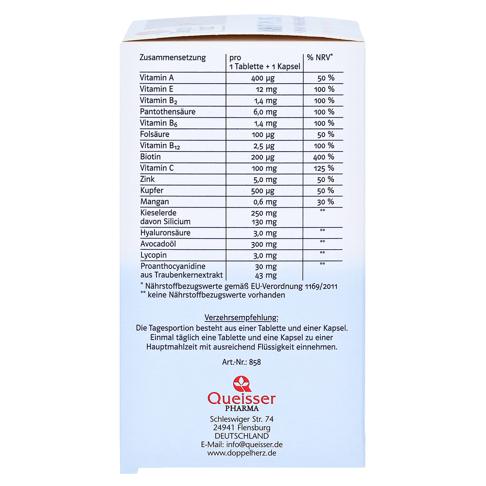 Многоплатежный витамин C вносит вклад в нормальное образование коллагена и, таким образом, для жизненно важной функции кожи. Витамин B2 и биотин и микроэлемент цинка вносит вклад в сохранение здоровой кожи. Марганец поддерживает образование, медь сохраняет нормальную соединительную ткань. Витамин В6 способствует нормальному белковому метаболизму для регулирования гормоновой активности и нормального синтеза цистеина. Cystein является частью структурного белка соединительной ткани. Кожа подвержена постоянному процессу роста или обновления.