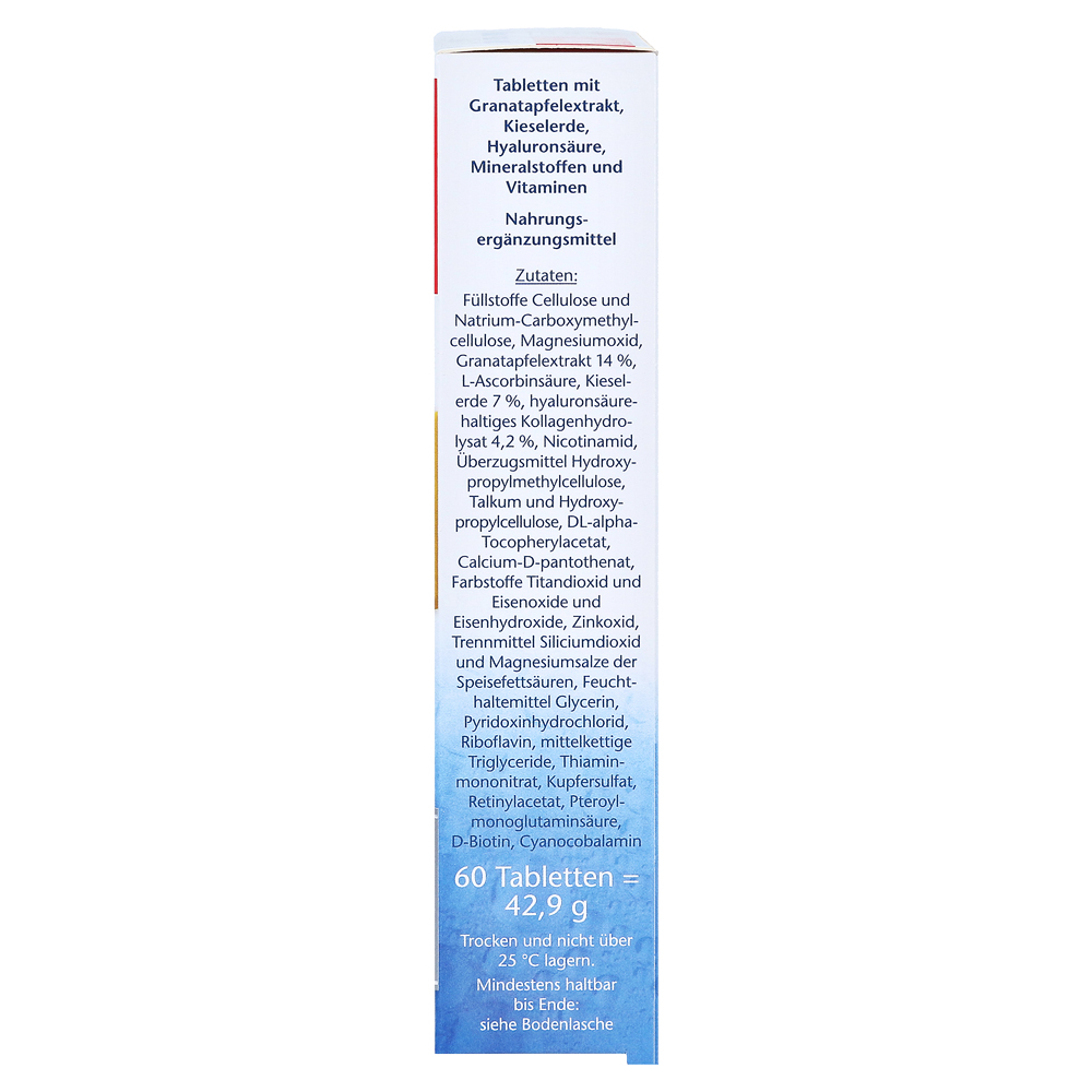 Двухместный сердечный кожа + волосы + ногти содержит рядом с экстрактом граната 100 мг, 50 мг диоксида кремния и 3 мг гиалуроновой кислоты, выбранные микроэлементы, которые соответствуют многочисленным функциям в организме.
