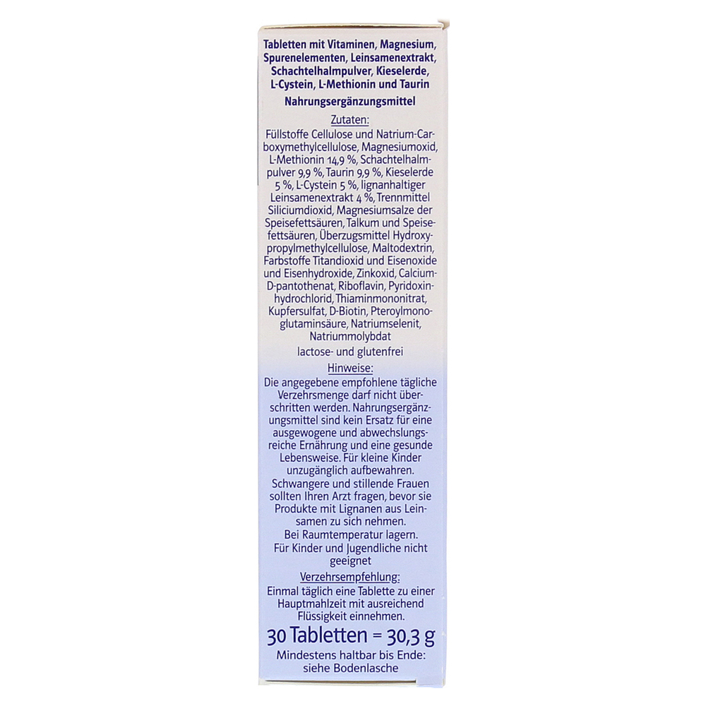 Trace Element MolyBdenum способствует метаболизму серысодержащих аминокислот. Планшет дополнительно содержит 10 мг линьяна от 40 мг вытяжки семян льна, 100 мг порошка приготовления пищи, 50 мг кремнезема, 50 мг L-цистеина, 150 мг L-метионина и 100 мг таурина. Линьян присутствует во многих злаках, бобовых, а также сортах овощей и фруктов. Самый богатый источник для лигнанов льна, потому что они содержат в 75 раз до 800 раз в Линганене по сравнению с другими растительными источниками. Если слишком мало хлопьев, покрытых хлопьями, фрукты рукава и овощи, потребляются только небольшое количество лигнанов для организма.