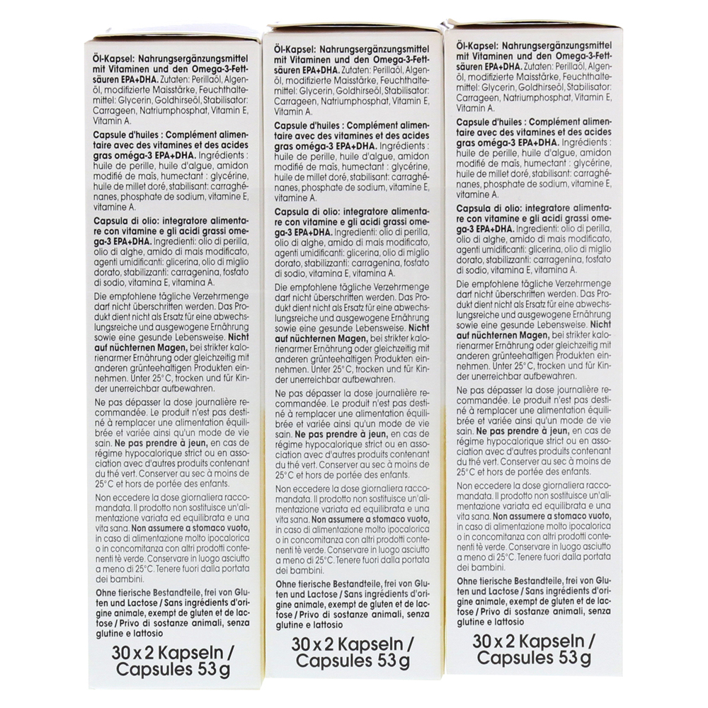 Масляная капсула содержит три высоко дозированных растительных масел: золотое просо масло (с ценным милиаксином), масло для периллы (китайская Мелисса) и масло водорослей (Жизнь DHA). Они имеют чисто качественные по всему миру и как источник ненасыщенного омега-3 жирных кислот, важных строительных блоков для здоровых клеток. Кроме того, масляная капсула обогащена витаминами A и E в качестве защиты клеток для упругости, жизненно важной кожи (лучшее).