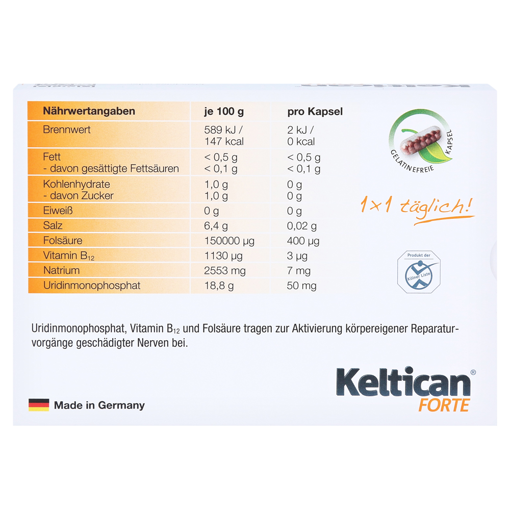 Keltican Forte содержит питательные вещества мо монофосфат моцинов витамина В12 и фолиевой кислоты, которые могут поддерживать собственные ремонтные операции организма. Особенно моциновый монофосфат как строительный блок РНК (рибонуклеиновая кислота) является большое значение для ремонта поврежденных нервов.