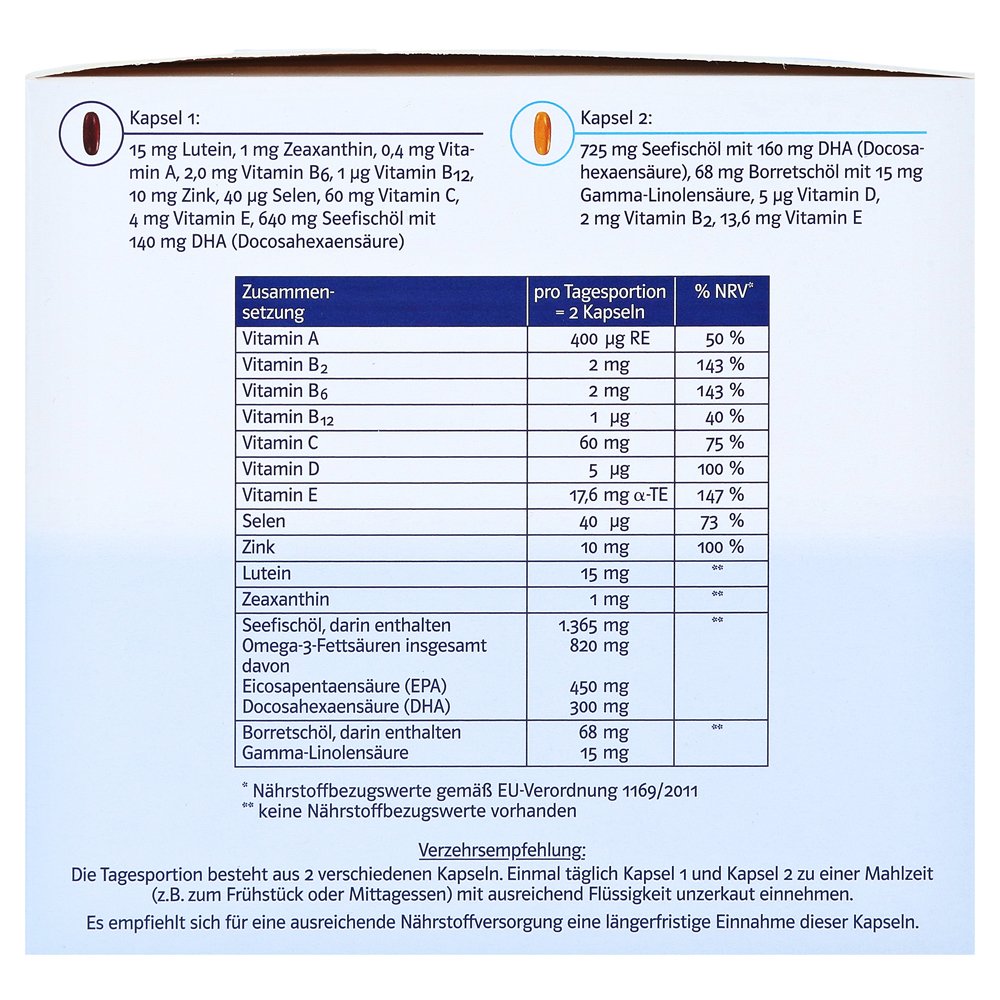 Капсулы также содержат 15 мг лютеин + 1 мг зеаксантина и омега-6 жирной кислоты гамма-линоленовой кислоты.