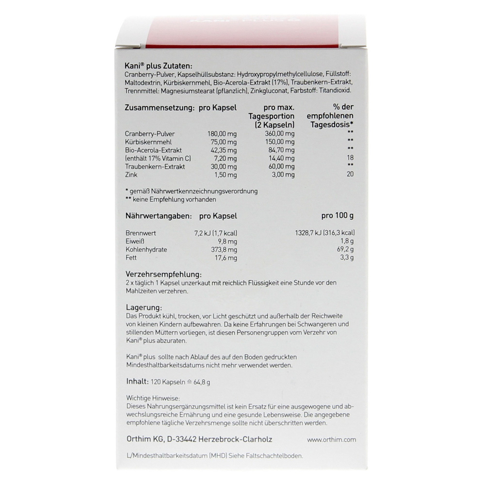 Kani® Plus + — это уникальные средства в его композиции. Каждая капсула содержит 5-кратную комбинацию клюквенного порошка, муки тыквы, экстракт биорецерола, экстракта винограда, экстракта винограда (с 40% OPC) и цинка. С рекомендуемым количеством 36 мг проантфоцианиды (PAC) достигается количество ежедневных применимых в науке. Kani® Plus +, таким образом, может защитить от рецидивирующего зажигания мочевого пузыря.