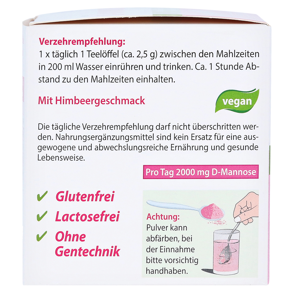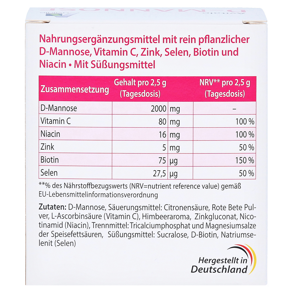 Порошок с малиновым вкусом содержит 2000 мг D-маннозы на 2,5 г.