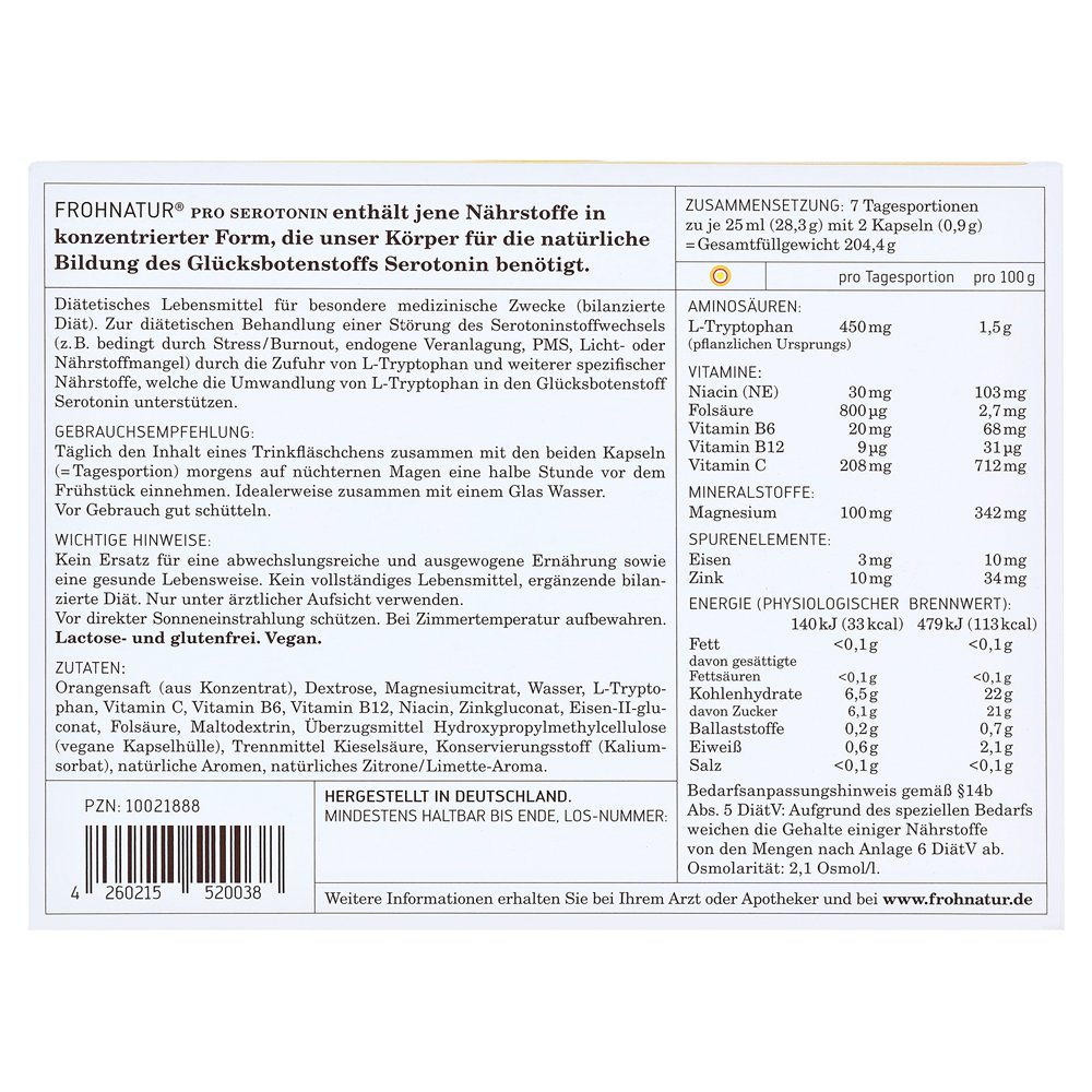 Для формирования серотонина наше тело требует определенных питательных веществ, в частности аминокислота L-триптофана. L-триптофан необходим, то есть он не может быть образован самим телом. L-триптофан является естественным ингредиентом нашей диеты. Это например, включены в «счастье» шоколада. Frohnatur содержит много L-триптофана: ежедневная часть содержит столько же, что и семи 100 грамм панелей молока, шоколад. В дополнение к L-триптофану, Frohnatur обеспечивает дополнительные важные питательные вещества для нашего тела, что поддерживает преобразование L-триптофана в счастливый материал серотонина. К ним относятся декстроза, витамины группы B, а также конкретные минералы и микроэлементы.