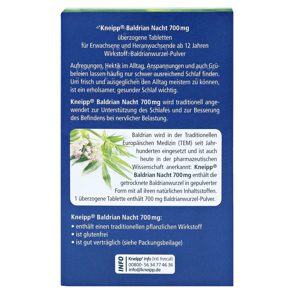 Кнайп Балдийская ночь 700 мг. Активное вещество: балдрийский корневой порошок 700 мг. Таблетки для использования у взрослых и подростков от 12 лет. Традиционное травяное лекарство для улучшения состояния с нервным бременем и поддержкой сна, исключительно на протяжении многих лет использования. Для рисков и побочных эффектов прочитайте пакетную листовку и спросите своего врача или фармацевта.