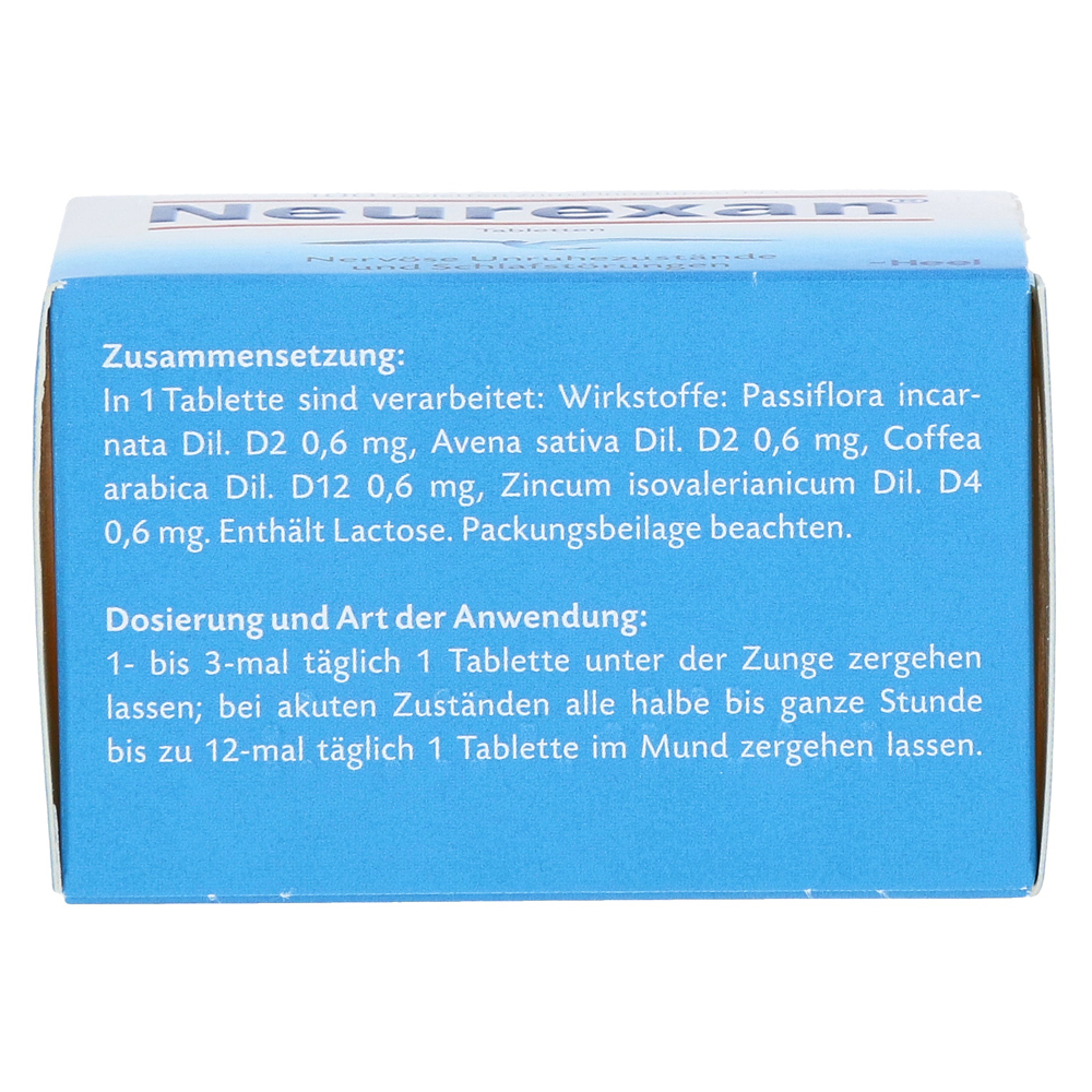 Neurexan — это естественное лекарство для тех, кто страдает от последствий стресса или слишком большого бремени и может плохо спать. Вечером активное сочетание ингредиентов пассифложеника (Passiflora incarnata), цветущей овсяной (Avena Sativa), высушенной кофейной семечью (Coffea) и цинк-солью балдрической кислоты (Zincum isovalianicum), расслабляющий эффект и способствует естественному засну. Благодаря быстрому эффекту Neurexan также можно использовать в течение дня в острых стрессовых ситуациях.