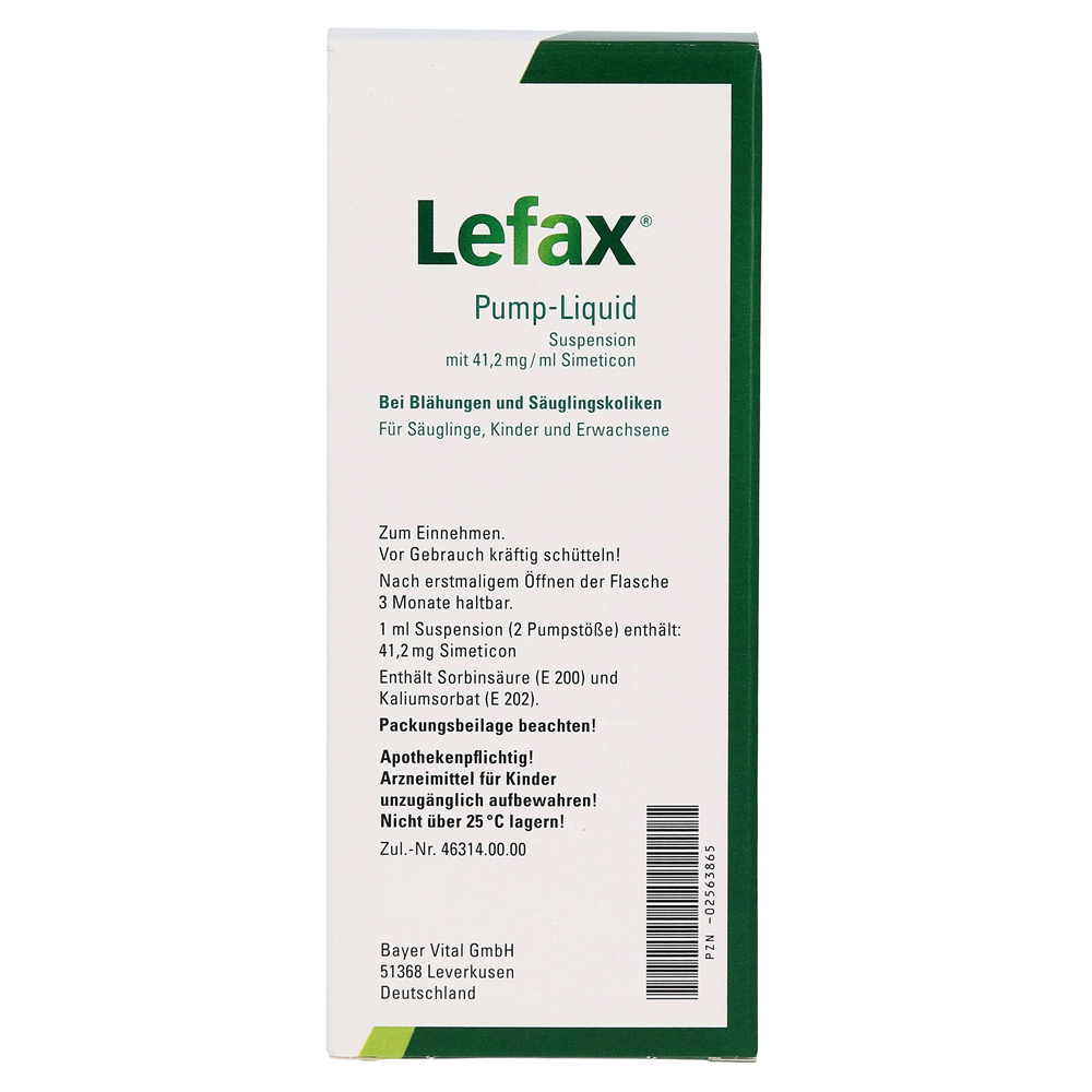 Lefax Pump Liquid помогает быстро и нежно осторожно против младенцев скольков или вздутие живота в младенцах. Он очень хорошо совместим, потому что он действует исключительно физически: активное вещество Simeticon меняет поверхностное натяжение пузырьков газа, которые происходят во время пищеварения и вызывают болезненное давление.