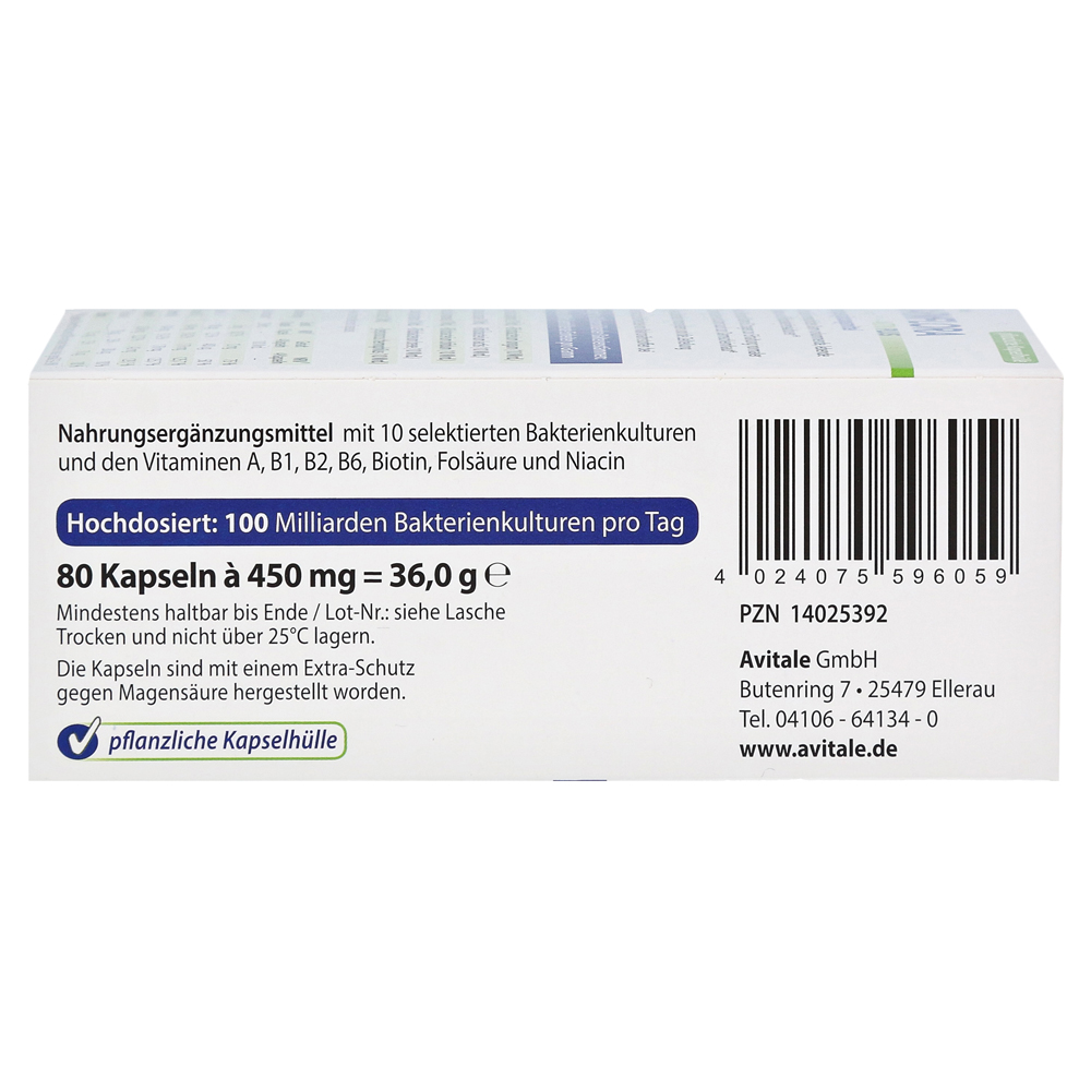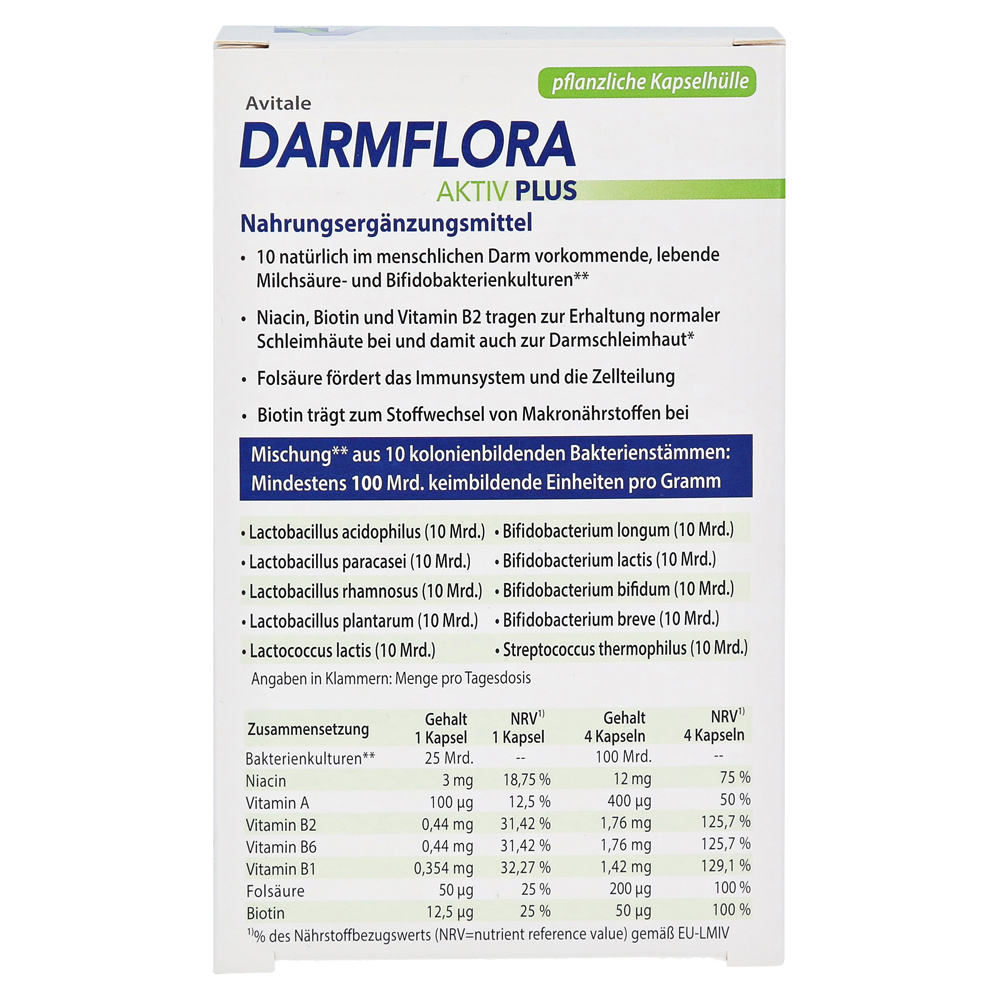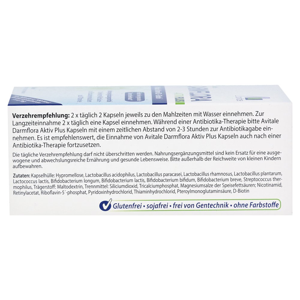 Avital Кишечная флора Active Plus содержит ниацин, витамин B2 и биотин, а также 10 выбранных молочных кислот и бифидобактериальных культур, которые также происходят в кишечнике человека.