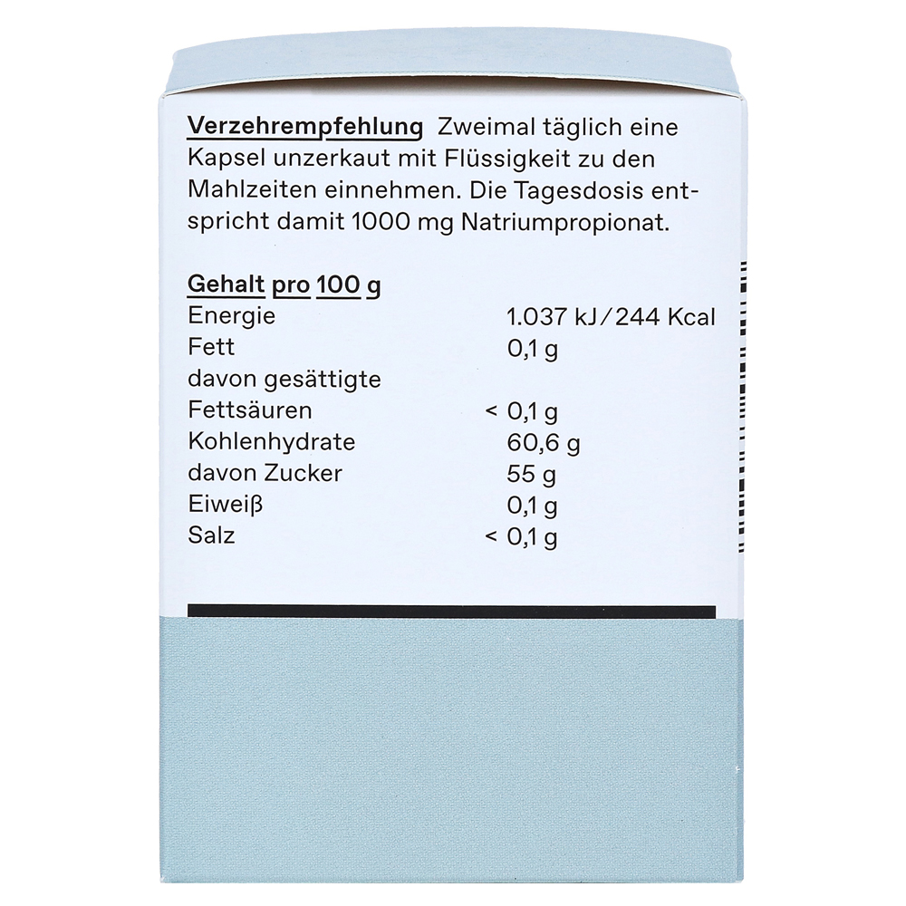 Капсулы пропиты содержат пропионат натрия, соль пропионовой кислоты, подсчетывая на короткие цепи жирных кислот. Жилье для человека требует коротких цепочек жирных кислот для здоровой кишечной флоры и регулирования собственных процессов различного организма. Если кишечник оптимально не поставляется с волокнами или короткоцепочечными жирными кислотами, общее физическое здоровье может быть нарушено. Поэтому может быть полезно питательная добавка с пропискими капсулами и, следовательно, подача коротких цепочек жирных кислот может быть полезным.