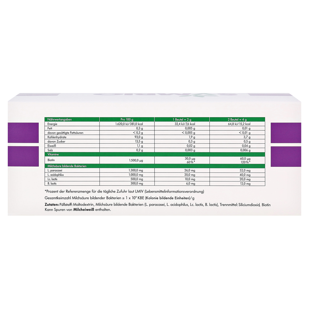 Пищевая добавка Symbilact Comp. Содержит как молочнокислые бактерии различных бактериальных штаммов, а также витамин биотин. Это служит для поддержания нормальной слизистой оболочки кишечника.