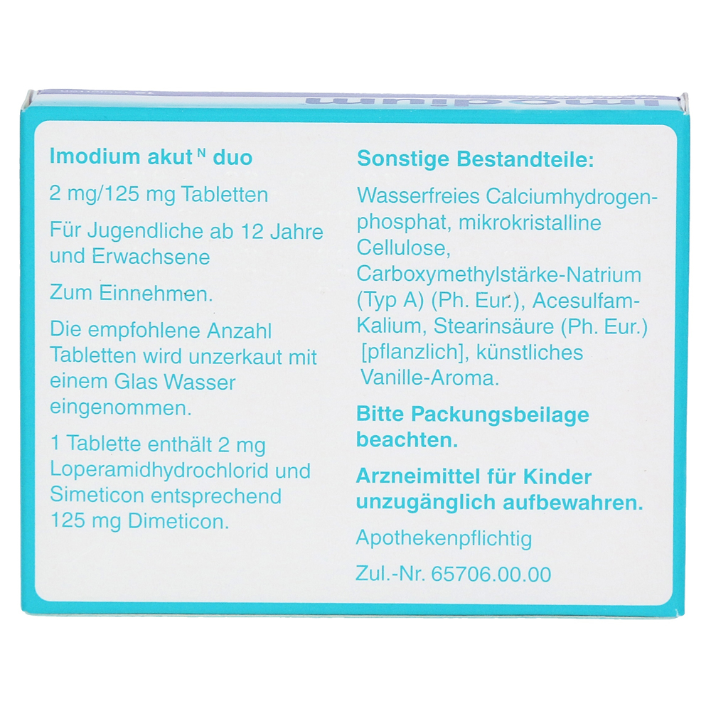 Таблетки Nimodium Acute n Duo используются для лечения острой диареи и содержат дополнительные активные вещества Simeticon для облегчения жалоб, связанных с газовым веществом в живом помещении, и, таким образом, обеспечивают дополнительную помощь с помощью подножия с помощью судорог.