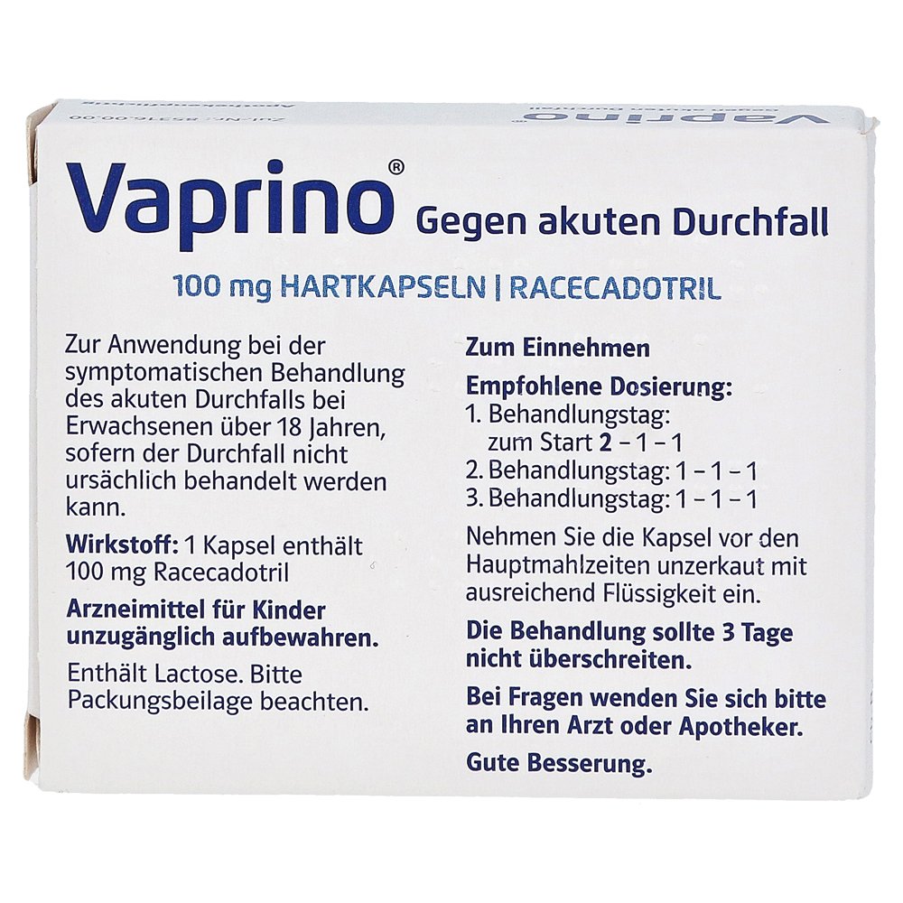 Естественное самовосстановление кишечника сохраняется при приеме Racecadotril — кишечное движение не тормозится. Если диарея основана на инфекции, ректоры диареи могут быть дополнительно устранены. Кроме того, VAPRINO снимает сопровождающие симптомы, такие как боль в животе, и не известны взаимодействия с другими лекарственными средствами.