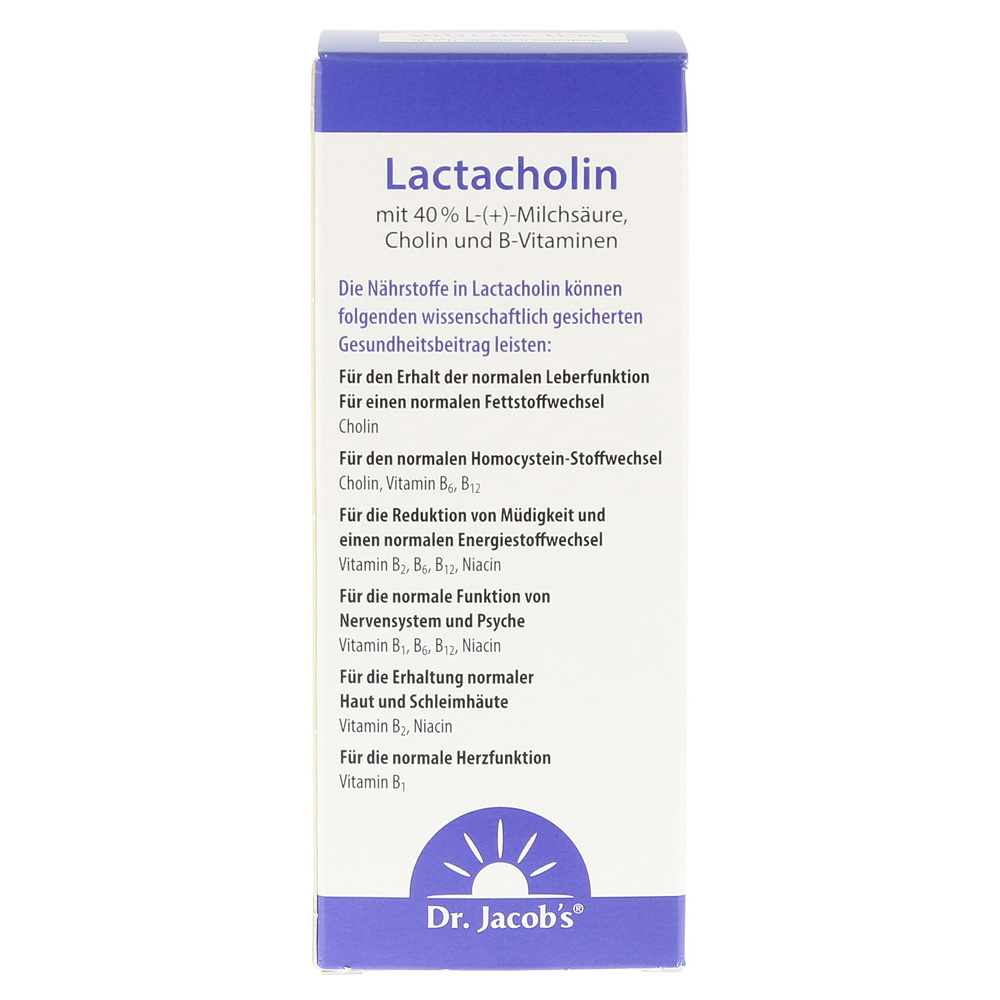 Доктор Лактахолин Джейкоба с L-(+) молочной кислотой, холином и витаминов B оптимально поддерживает метаболизм энергии, жира и гомоцистеина, а также сохранение нормальной функции печени. Homocysteine - это продукт разложения белка, для которого холина требуется дополнительный метаболизм организма тела, также витамины B6 и B12. В витаминах B все еще важны для нервов и нормальной психологической функции, а также для иммунной системы и сохранения кожи и слизистых оболочек. Они выполняют центральные задачи как коферменты в энергетическом метаболизме и могут помочь уменьшить усталость.