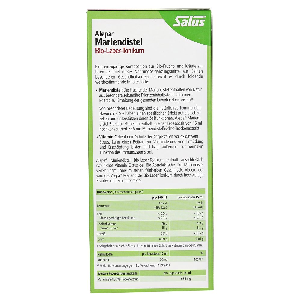 Alepa Mariendistel Bio-Liver Tonic содержит натуральный витамин С от органических ацерольных шин, а также высококачественные травяные и фруктовые экстракты.