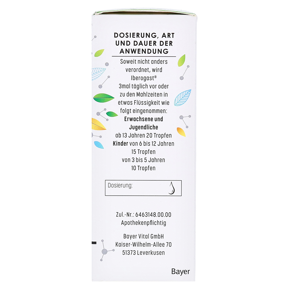 Iberogast принимается 3 раза в день до или при еде с некоторой жидкостью. Взрослые и подростки с 13 лет каждый забирают 20 капель, дети от 6 до 12 лет 15 капель и детей от 3 до 5 лет 10 капель.