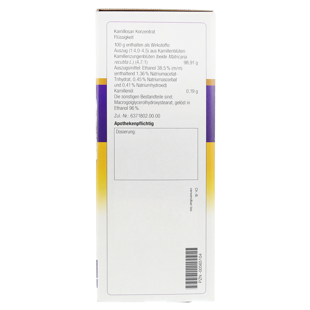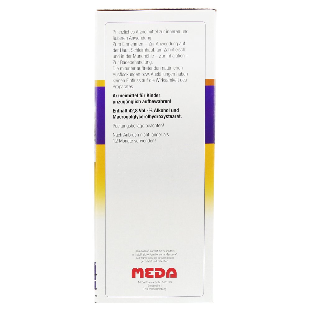 Камиллозан — единственная ромашка абстракция от особенно активной веществ, богатой веществом, запатентованной ромашкой Манзаны. Его специальный производственный процесс гарантирует постоянно высокое содержание активных ингредиентов.