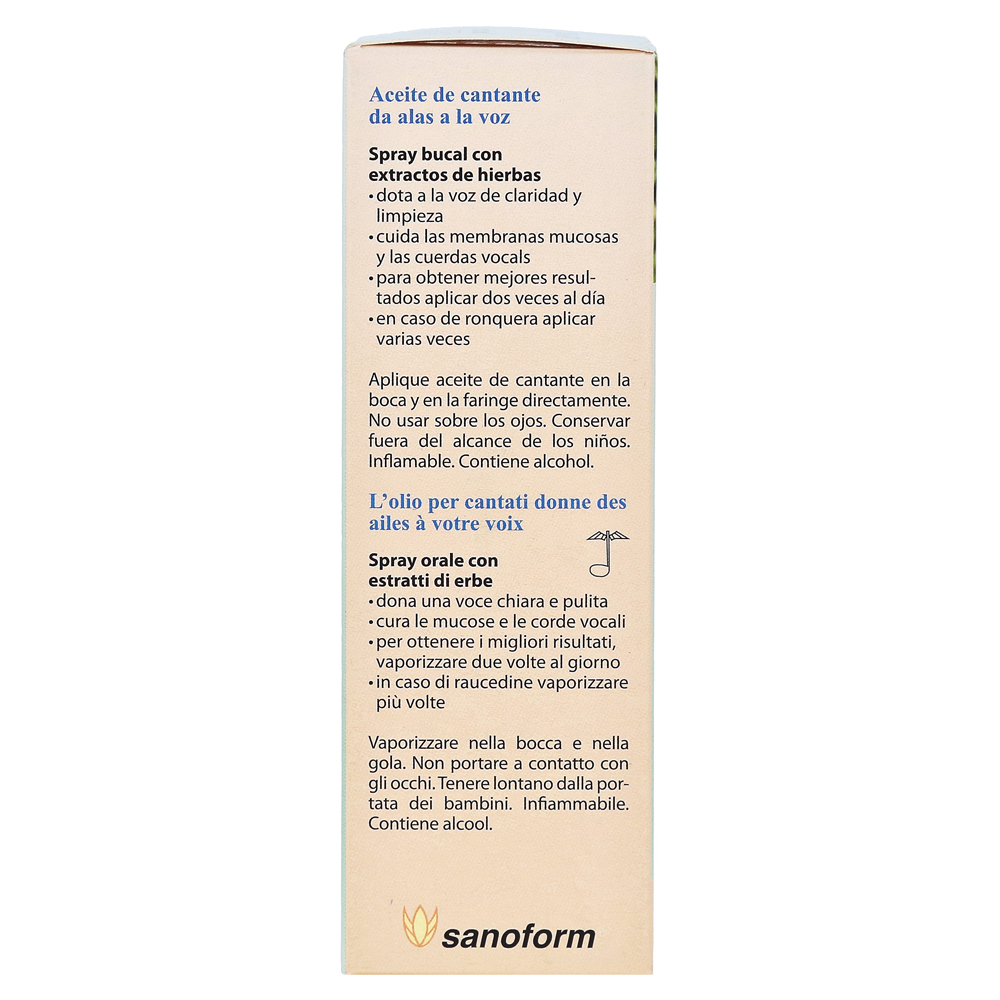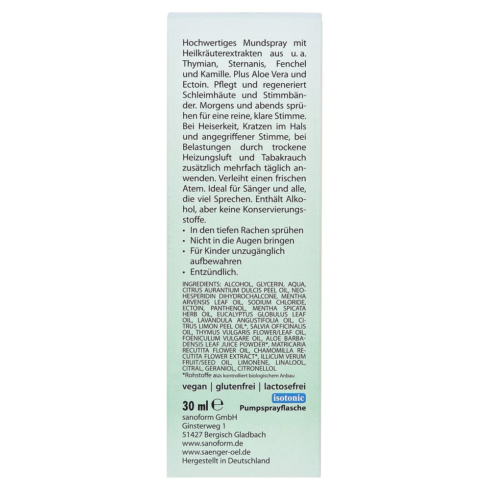 Высококачественная подготовка с естественными эфирными маслами защищает от хрипоты в сильно подчеркнутых вокальных лентах. Певичное масло поддерживает слизистые оболочки для нагрузок из-за сухого нагревательного воздуха и табачного дыма. Это дает свежее дыхание и идеально подходит для певцов, и все, кто много разговаривает.