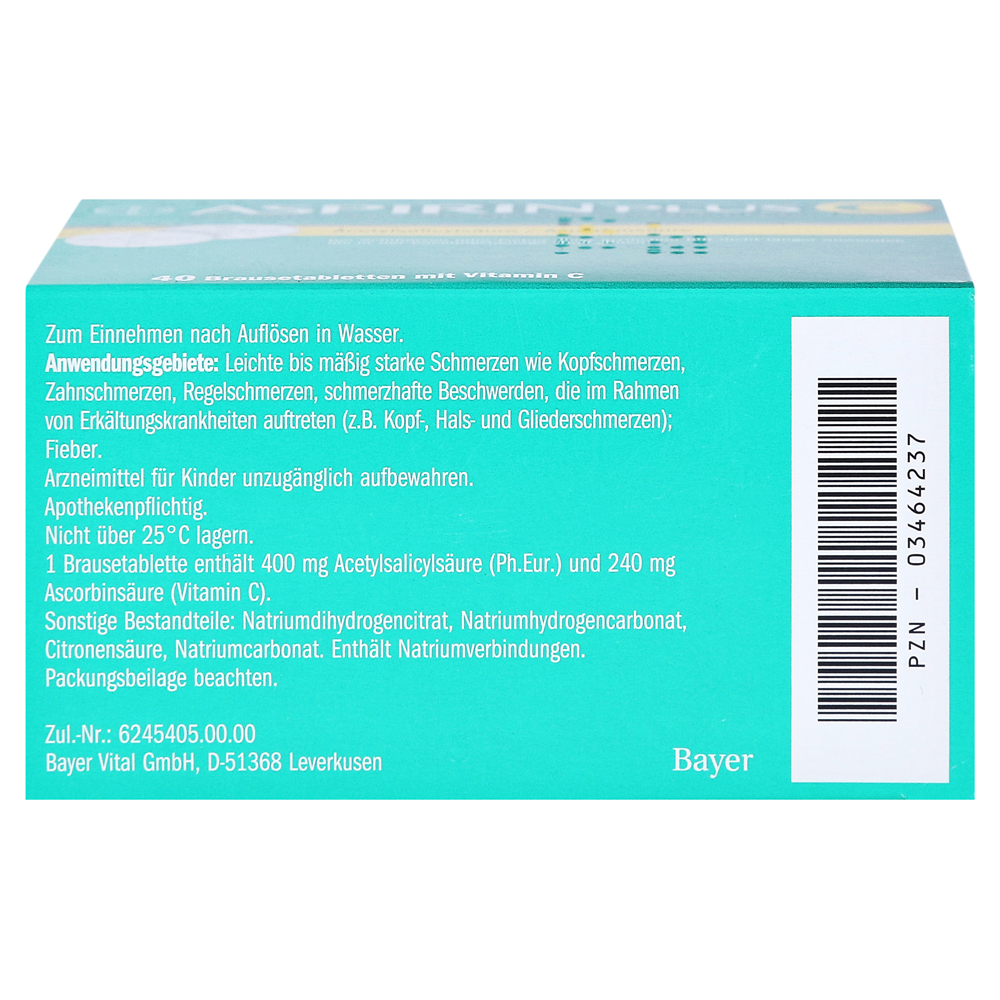 Элементы в контексте простуды до умеренно сильной боли и лихорадки, ASPIRIN® PLUS C обеспечивает быстрое облегчение. Шипучая таблетка растворяется до проглатывания в воде, что означает два преимущества: с одной стороны, содержащийся активный ингредиент ацетилсалициловой кислоты уже активирован в это время и, таким образом, может быть быстрее поглощено организмом, то есть боль и лихорадка быстро и эффективно боролся. С другой стороны, пользователи дополнительно принимают жидкость к себе, что чрезвычайно важно в холоде.