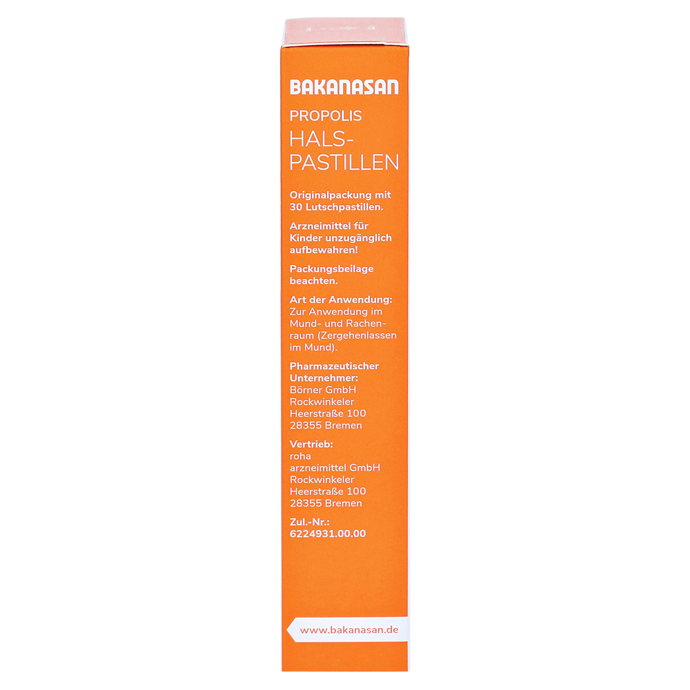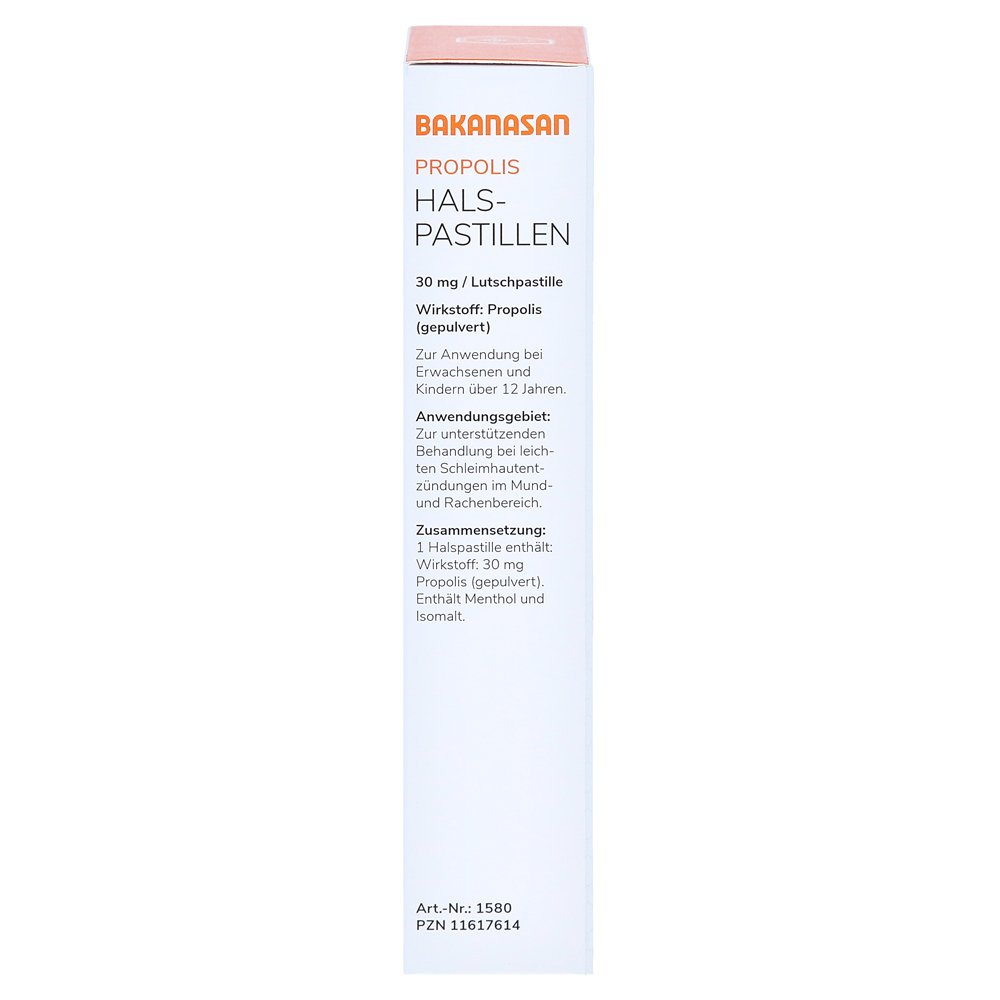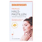 Баканасан прополис половину спастиллы служат, чтобы облегчить и лечить легко воспаленные слизистые оболочки. К ним относятся симптомы, такие как первая боль в горле, «царапаясь в горле» и глотанием.