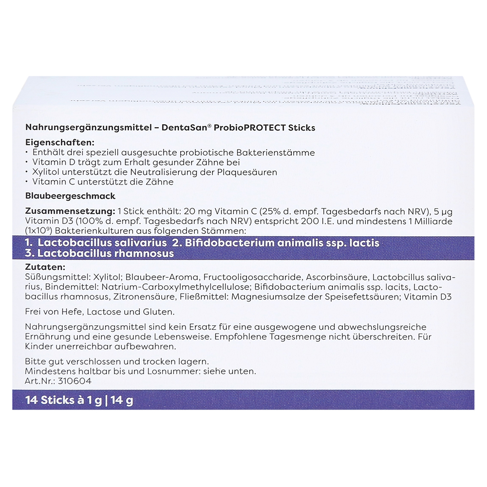 Dentasan ProbioProtect — это пищевая добавка с 3 выбранными пробиотическими бактериальными штаммами. Маркакрабиота может помочь ингибировать рост больных бактерий во рту. Содержащиеся витамины C и D способствуют сохранению здоровых зубов. Ксилит поддерживает нейтрализацию зубных кислот. Прямые гранулы вкусывают фруктовые чернику и могут быть легко взяты непосредственно благодаря практической части билетов.