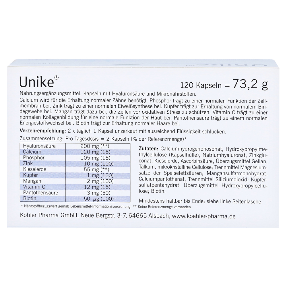 Капсулы Unike содержат комбинацию натуральных «косметических веществ», которые подают организм со всеми важными микро-питательными веществами для красоты кожи, волос и ногтей. Unike Capsules, в отличие от крема или других продуктов по уходу на внешне, действуют непосредственно в организме.