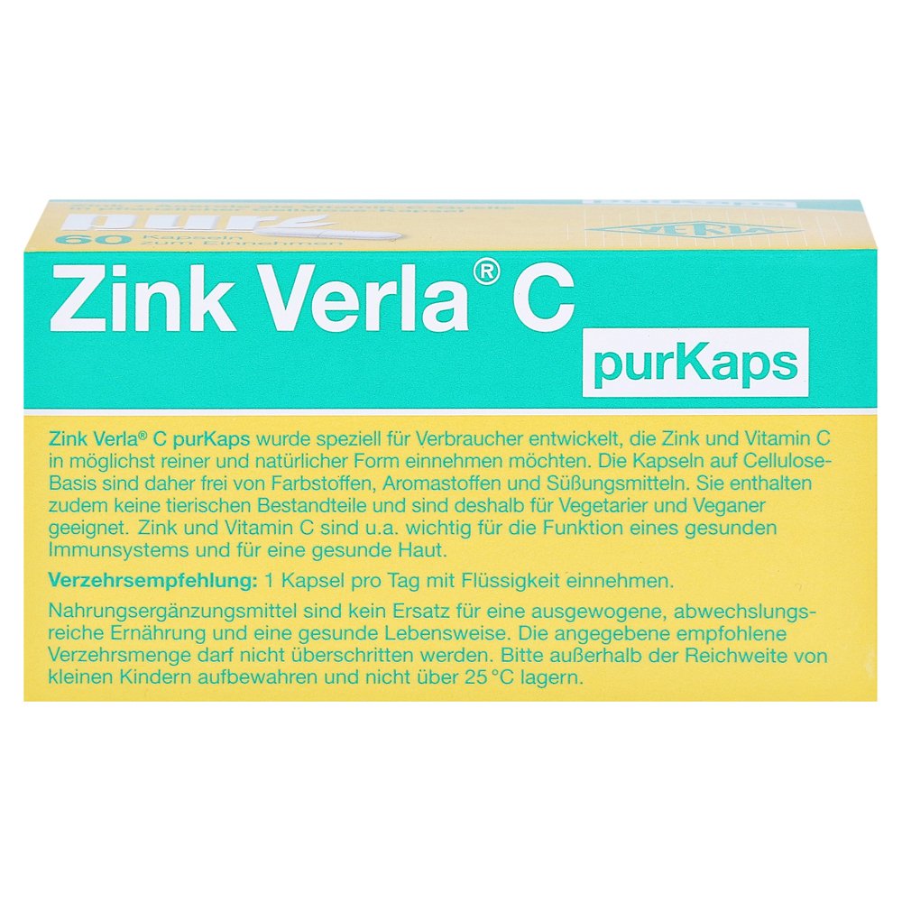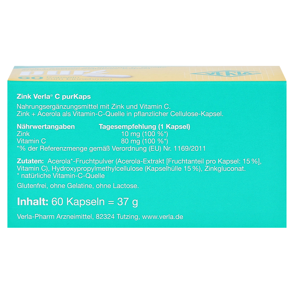 В овощной целлюлозной капсуле. Цинк Verla C Purcaps был разработан для пользователей, которые хотят занимать цинк в чистом виде, так и витамин C как можно более естественным. С 10 мг цинком как органический цинковый глюконат для хорошего выстрела в организме и 80 мг натурального витамина С из плода ацерола.