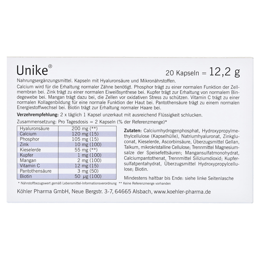Капсулы Unike содержат комбинацию натуральных «косметических веществ», которые подают организм со всеми важными микро-питательными веществами для красоты кожи, волос и ногтей. Unike Capsules, в отличие от крема или других продуктов по уходу на внешне, действуют непосредственно в организме.