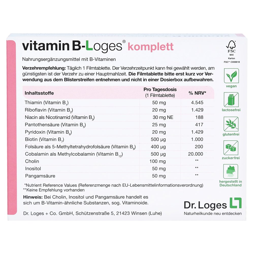Витамин B-LOGES полностью подает организму всеми 8 В витаминов. Кроме того, пищевая добавка содержит витаминоиды Пангаминовые кислоты, холин и инозита, которые дополняют включенные витамины B.